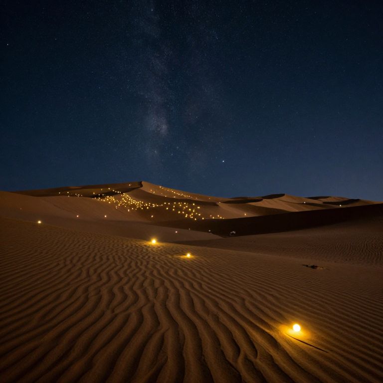 Twinkling golden lights scatter across rippling sand dunes under a star-studded night sky, forming ever-changing constellations that dance in response to the silent whispers of travelers' thoughts.