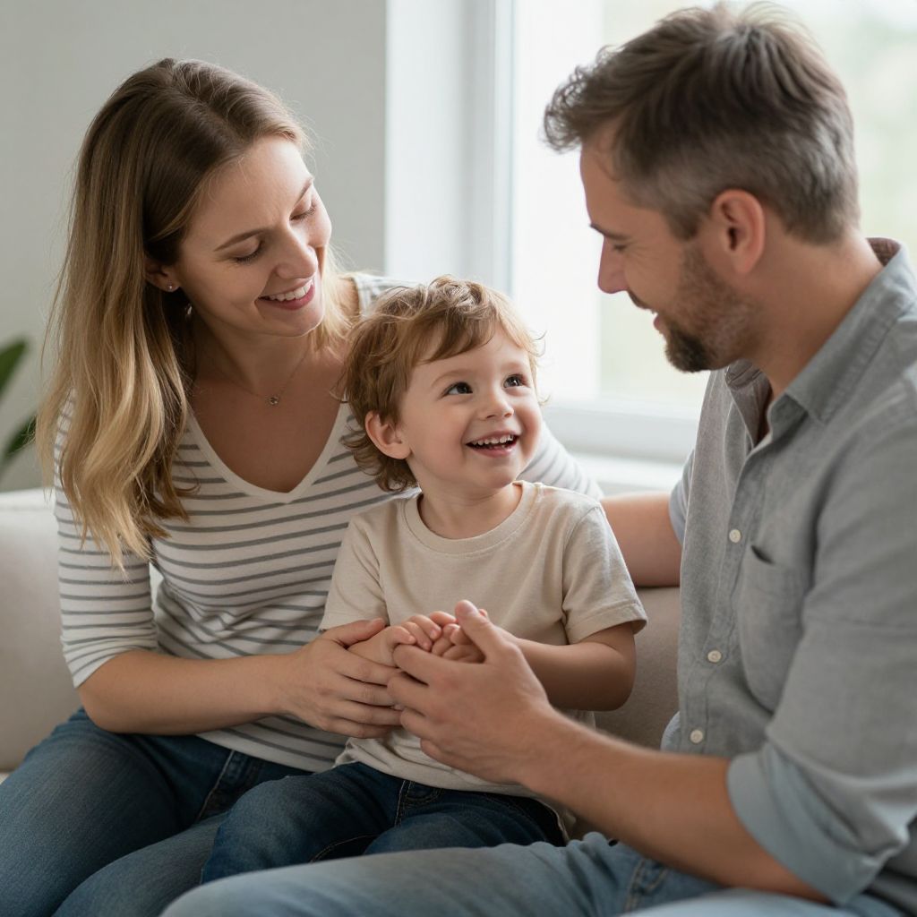 Photograph of a Caucasian family of three sitting together on a couch in a brightly lit room. A blonde woman with straight hair, wearing a white and black striped shirt, smiles warmly at her son. The young boy, with light brown hair and a white T-shirt, looks up at his father, laughing joyfully. The father, with short gray hair and a beard, wearing a light blue button-down shirt, looks at his son with a gentle smile. They are holding hands, creating a sense of closeness and happiness. Sunlight streams in from a window in the background.