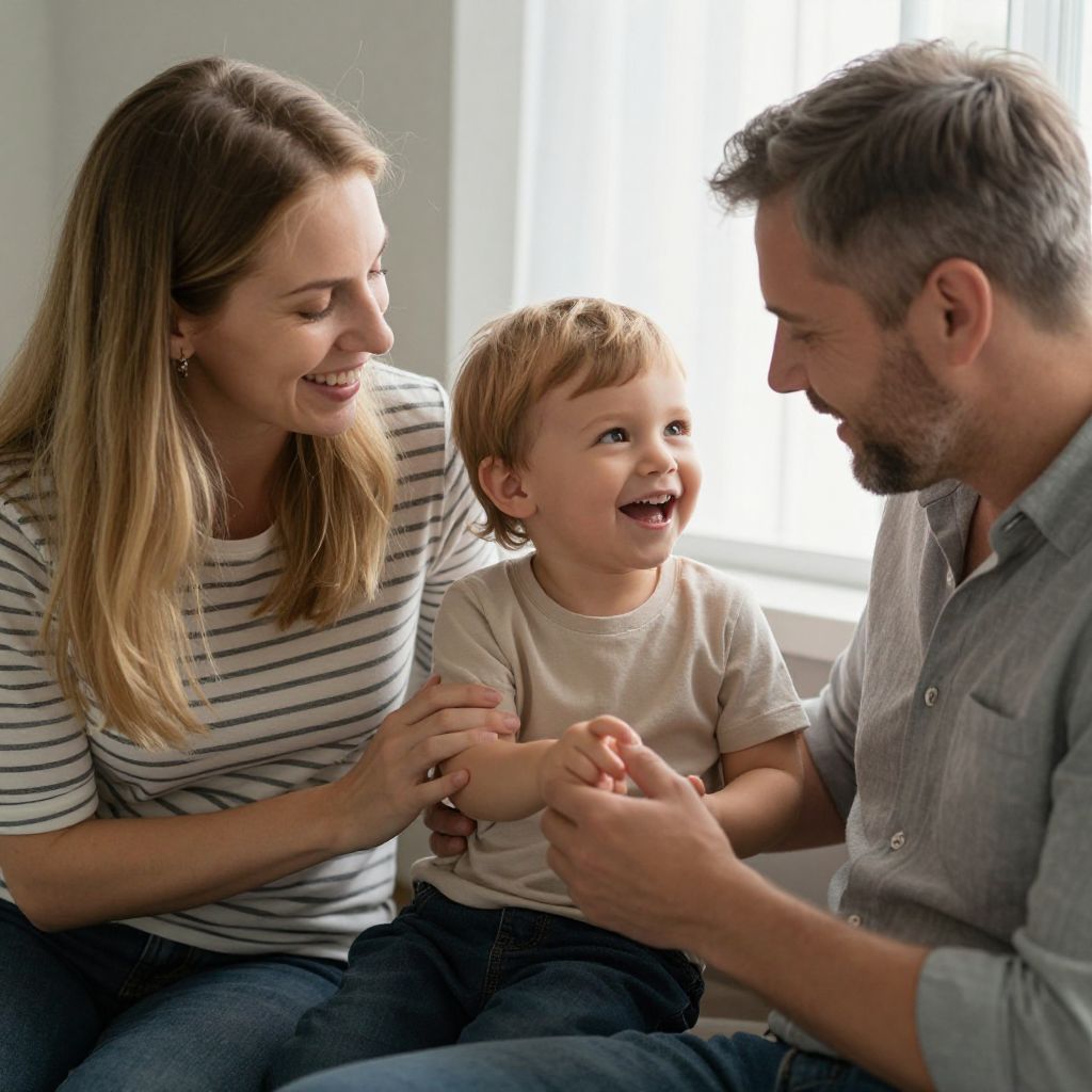 Family bonding moment captured indoors, featuring a smiling woman with long blonde hair wearing a striped shirt, sitting beside a joyful toddler in a beige T-shirt, while a man with gray hair and a beard, dressed in a gray shirt, holds the child's hand, all sharing a warm and affectionate interaction near a softly lit window.