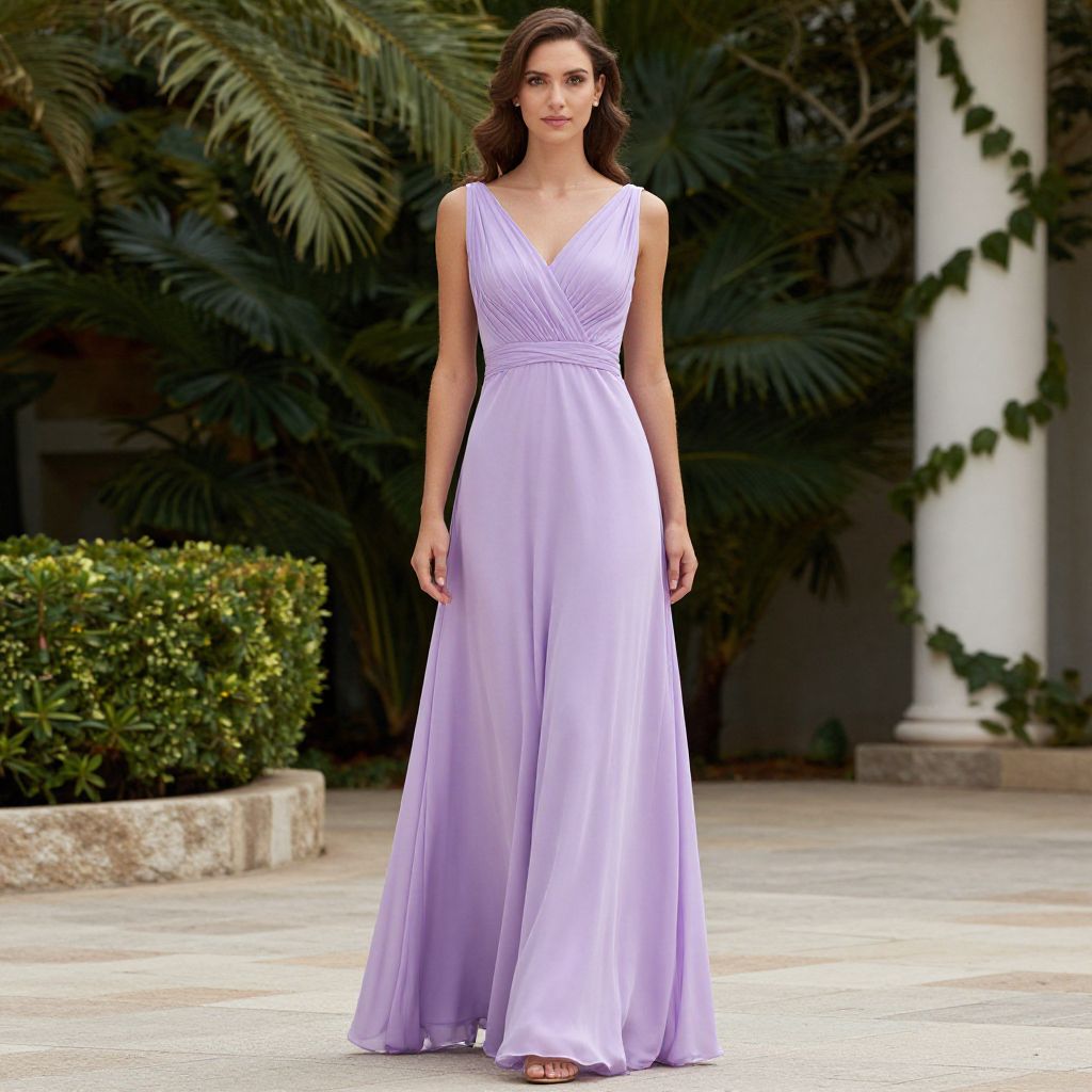 Elegant woman posing gracefully in a long, flowing lilac chiffon sheath dress featuring a V-neckline and a draped bodice, perfect for a wedding guest or bridesmaid.