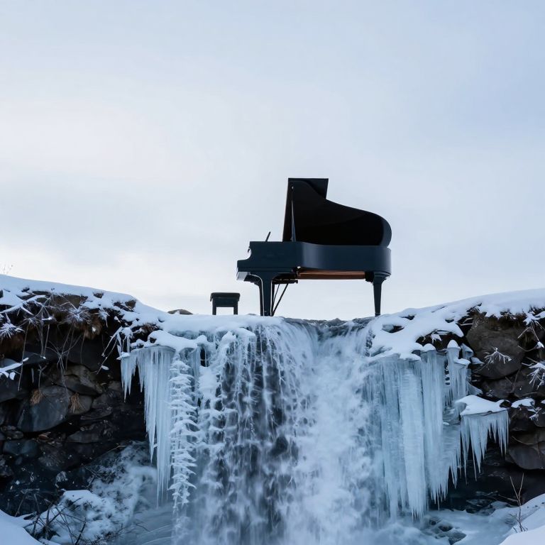 Photograph of a black grand piano silhouetted against a bright, snowy sky. The piano is positioned atop a rocky, snow-covered ledge with a small, icy waterfall cascading down in front of it. Long icicles hang from the rocks, adding a textured, crystalline effect. The background is stark white, emphasizing the contrast with the dark piano and the shimmering ice. The scene evokes a surreal, wintry atmosphere, blending natural elements with an unexpected musical instrument. The overall composition is striking and evocative, combining cold textures with a classic musical object.
