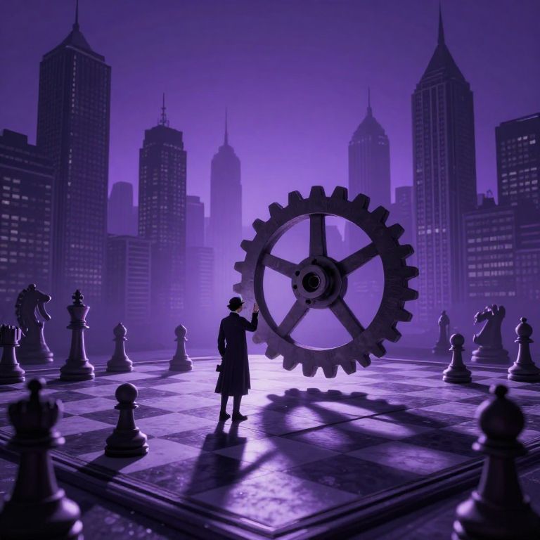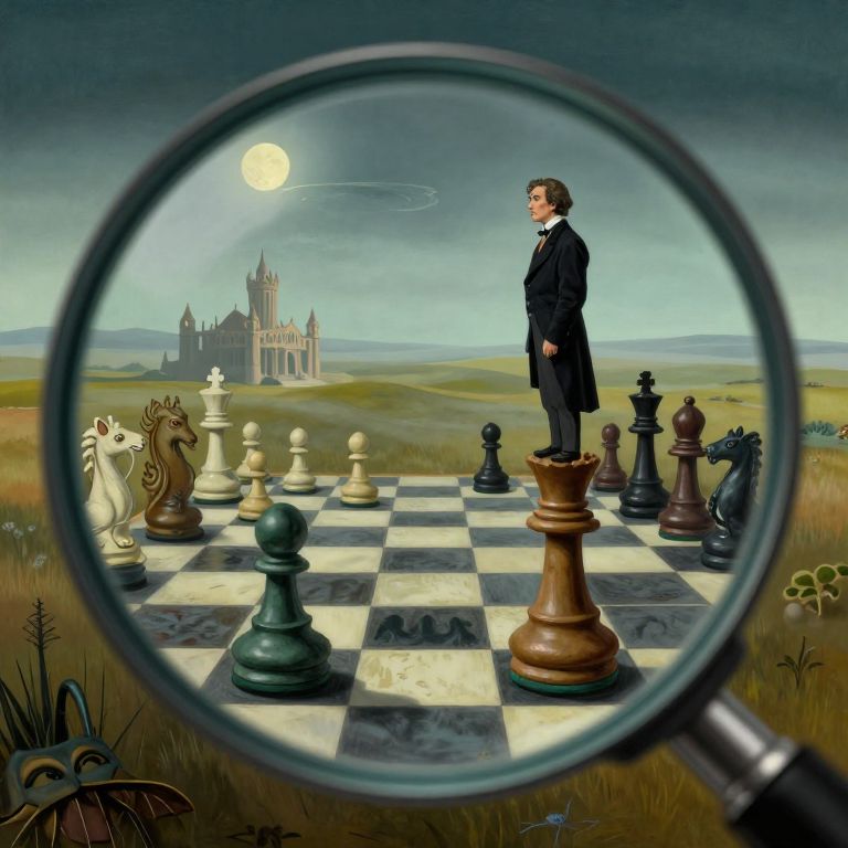 Craft an image that embodies the surreal essence of Dali's paintings, depicting a chessboard-sized landscape extending into infinity over a foggy, moonlit field from a close-up perspective akin to seeing through a magnifying glass. Pore over each chess piece transformed into mythical creatures and renowned architectural marvels similar to Dali’s hallmark works. Intensify the chilling mood with a solitary figure in Victorian garb atop one of the larger chess pieces, gazing pensively at the expansive vista before them, their expression a mix of contemplation and bewilderment as they contemplate the cryptic game unraveling across this dreamlike terrain.