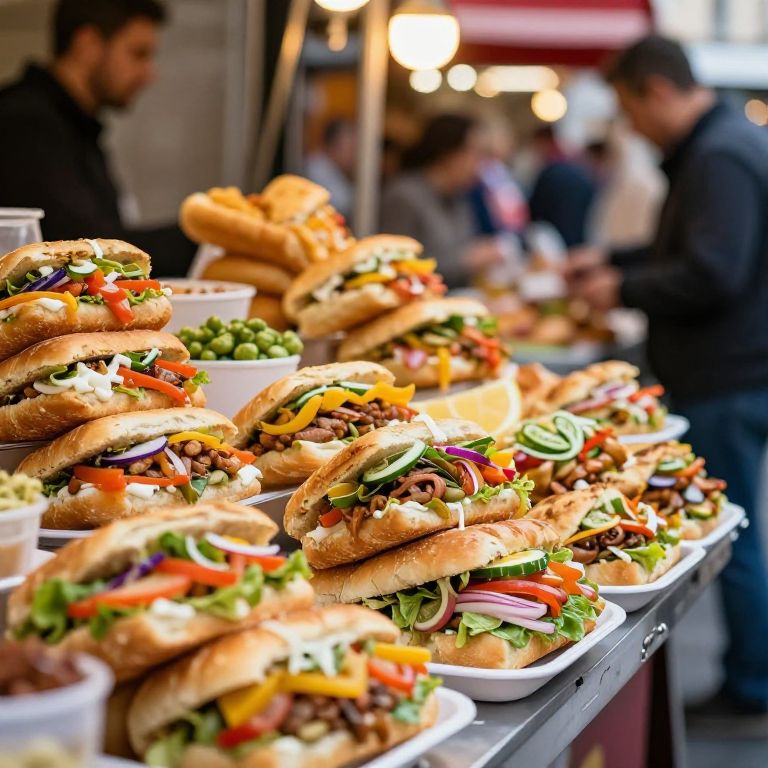 Photograph of a vibrant street food market stall displaying numerous stacked, colorful sandwiches. The sandwiches, filled with a variety of ingredients including lettuce, tomatoes, peppers, onions, and beef, are piled high on white trays. The background is slightly blurred, featuring two men in dark clothing, one with a beard, standing and conversing. Warm, bokeh lights from the market illuminate the scene, adding a lively atmosphere. The focus is sharp on the sandwiches, highlighting their fresh, colorful ingredients and soft, golden-brown buns. The overall texture is rich and appetizing, with a bustling, outdoor market vibe.