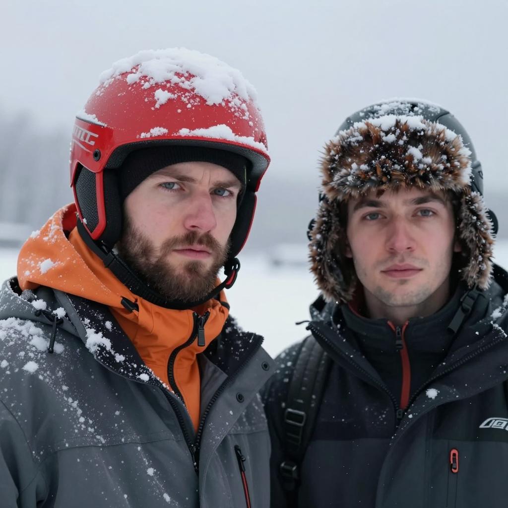 Portrait of two men dressed in winter outerwear and helmets outdoors in snowy weather. The man on the left wears a red helmet with snow on top, an orange hood, and a gray coat with snowflakes. He has a beard and an intense expression. The man on the right wears a black fur-lined helmet, a dark winter jacket, and has a clean-shaven face with a neutral expression. Both men are standing against a blurred snowy background in dim lighting.