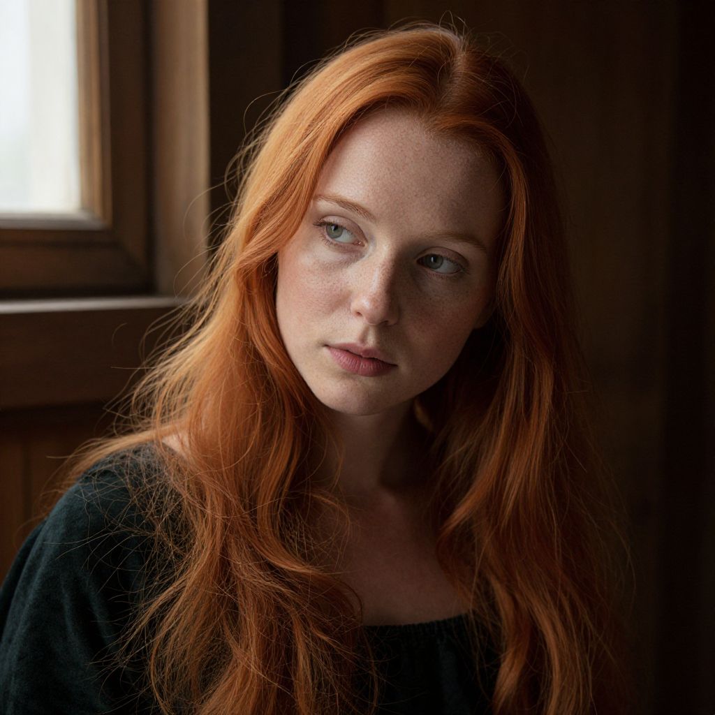 Photograph of a fair-skinned, red-haired woman with long, wavy hair. She has light blue eyes, subtle freckles, and a neutral expression. She wears a simple black top, and the lighting creates soft shadows on her face. The background is dark, with a wooden frame of a window on the left side, allowing a small amount of light to enter. The overall mood is introspective and slightly melancholic, with a focus on her natural beauty and the warm, earthy tones of her hair and surroundings.
