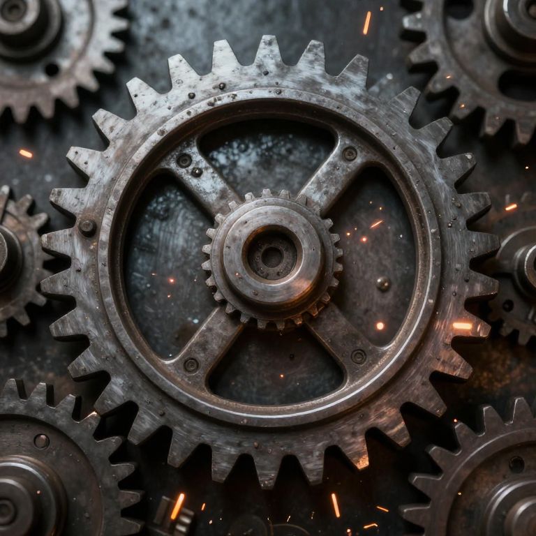 Disagreement symbolized by two mechanical gears grinding against each other with sparks flying, industrial steampunk setting, close-up view, muted metallic colors with glowing orange highlights, gritty and powerful mood