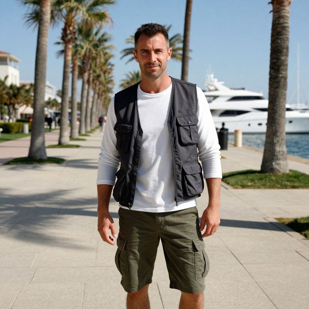 A man, layered long-sleeve shirt, utility vest, slim-fit cargo shorts, dark olive green, sunlit promenade, palm trees swaying, luxury yachts docked, 3M ferrania analog film stock, relaxed smile, confident demeanor.Man has masculine face and piercing eyes