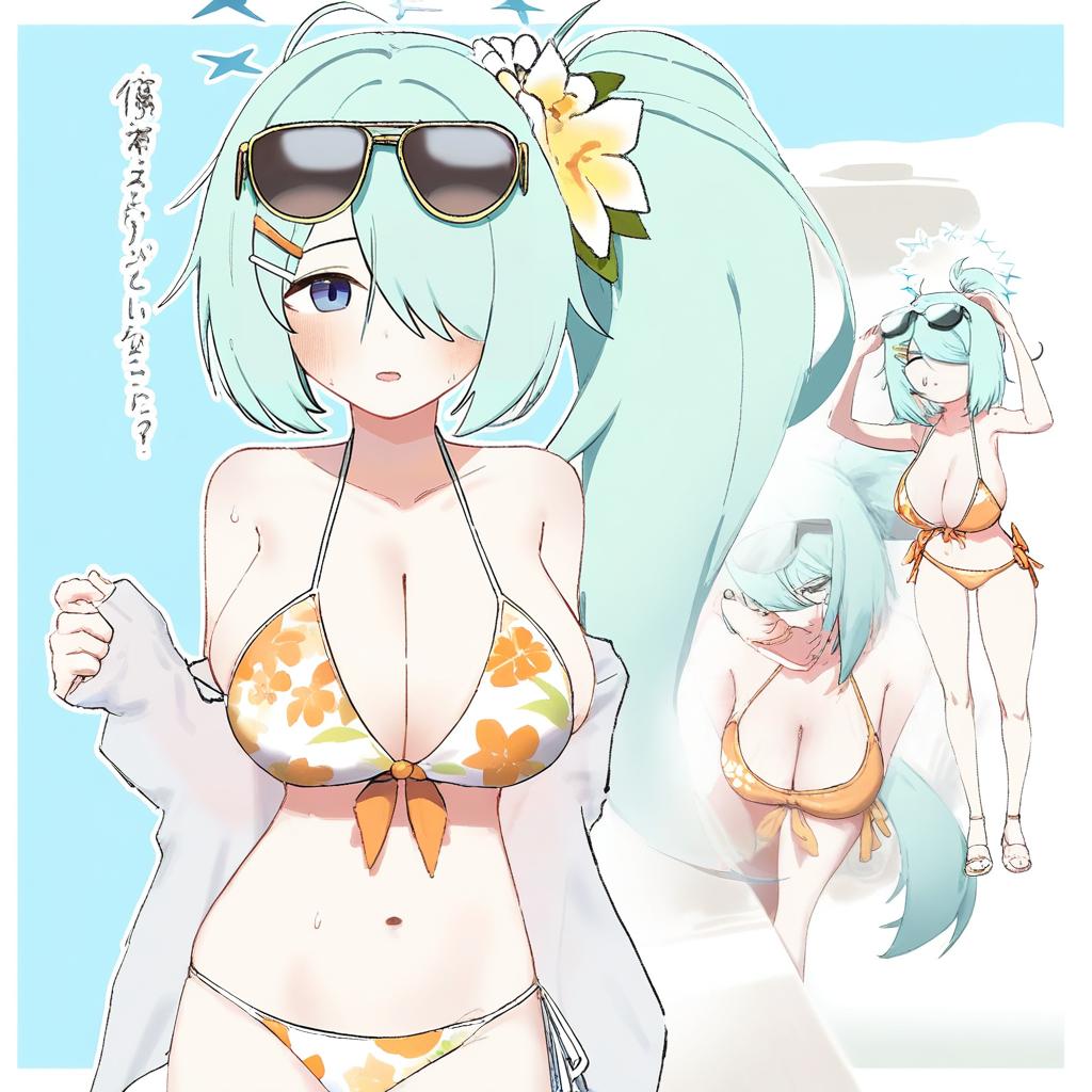 Hiyori (swimsuit) (blue archive), blue archive, 1girl, hair over one eye, eyewear on head, aqua hair, long hair, side ponytail, hair flower, large breasts, cleavage, navel, collarbone, sunglasses, orange bikini, white bikini, halo, bare shoulders, floral print bikini, by artist artpatient, leet