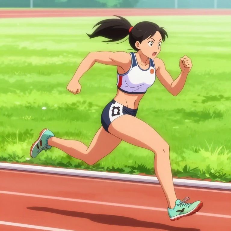 Athlete anime girls sprinting fiercely on a vibrant track field, dynamic poses, bright sunlight, detailed muscles, vivid colors, anime style, energetic and powerful atmosphere