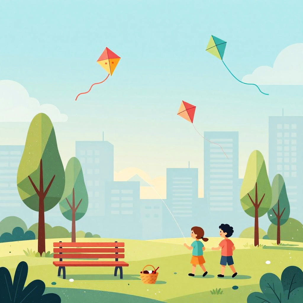 Clean vector flat design set in a bright modern city park at sunrise with abstract geometric trees, depicting two children flying colorful kites shaped like birds beside a red bench and a scattered picnic basket. The background falls from dark teal to light blue in a smooth gradient. Whimsical tone, refined composition, tactile detail, vibrant color, soft rim light, subtle texture, high detail, balanced layout.