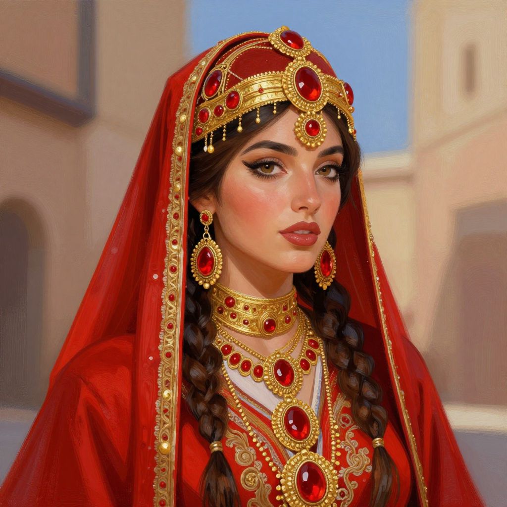 A vibrant digital illustration inspired by traditional Berber attire, featuring a woman adorned in rich red fabric, intricate gold jewelry, and bold red gemstones, rendered with a painterly, high-definition style reminiscent of Helen Redman's work.