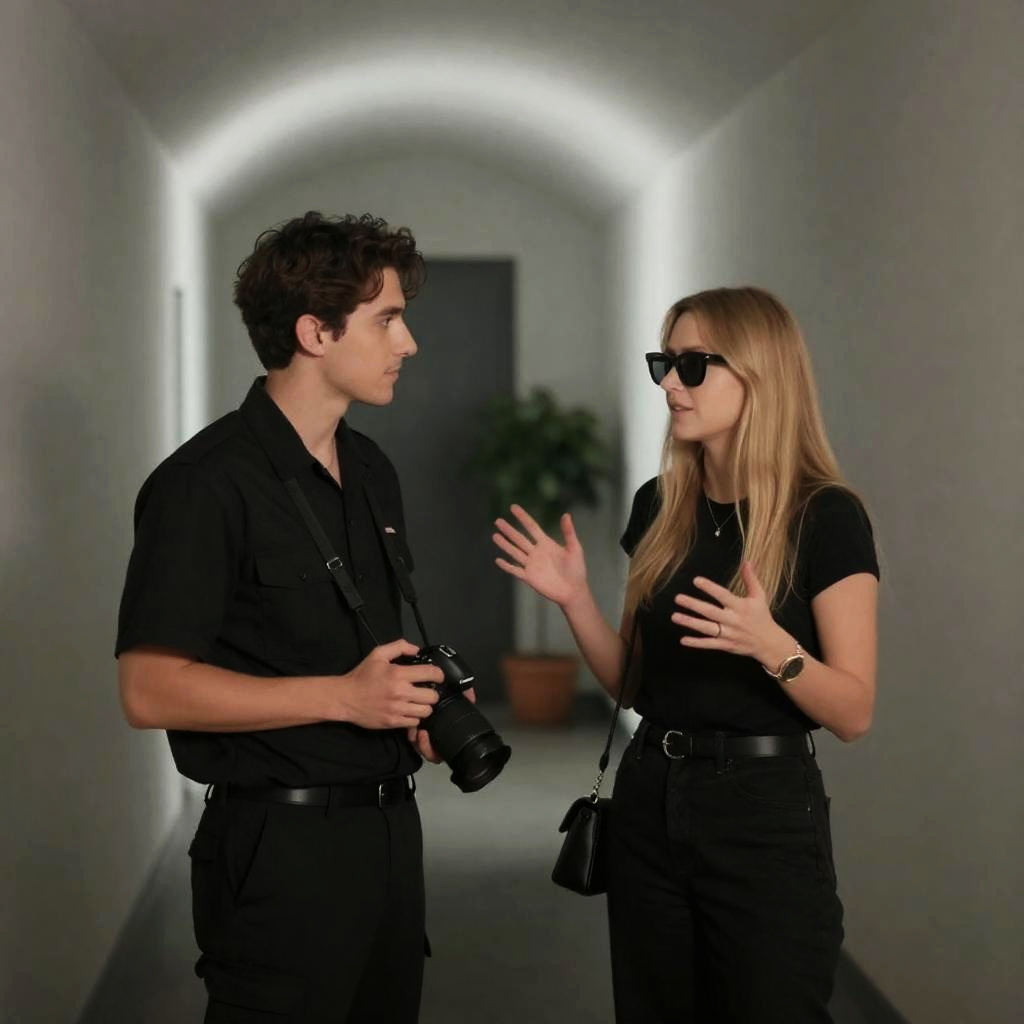 Photograph of a hallway. Two people, man and woman, standing. Man on left, dark short hair, black uniform, holding camera. Woman on right, blonde hair, black sunglasses, black outfit, hands gesturing. Soft light, gray walls, arched ceiling, potted plant in background. Man looks at woman, woman looks at man. Casual interaction.