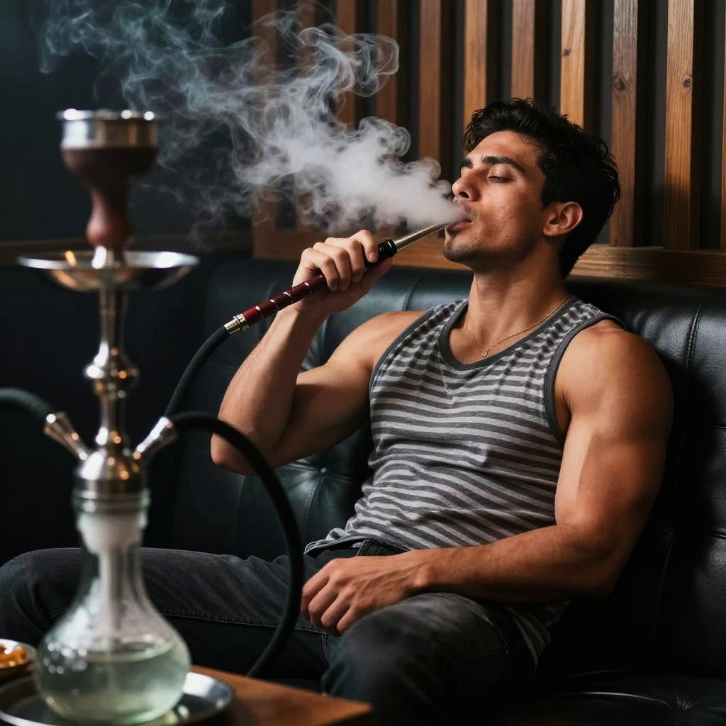 Photograph of a muscular man with short dark hair and a sleeveless striped shirt, relaxing on a black leather couch, smoking from a hookah. He's exhaling a plume of smoke. In the foreground, a glass hookah with a lit bowl is slightly out of focus. The background is dimly lit with wooden slats. The overall vibe is cool and laid-back.