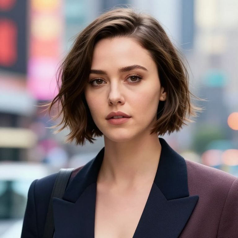 Kat Dennings short hair styled in a modern, edgy bob, vibrant city background, soft natural lighting highlighting sleek texture, fashionable outfit, cinematic portrait, sharp details, realistic skin tones, high resolution