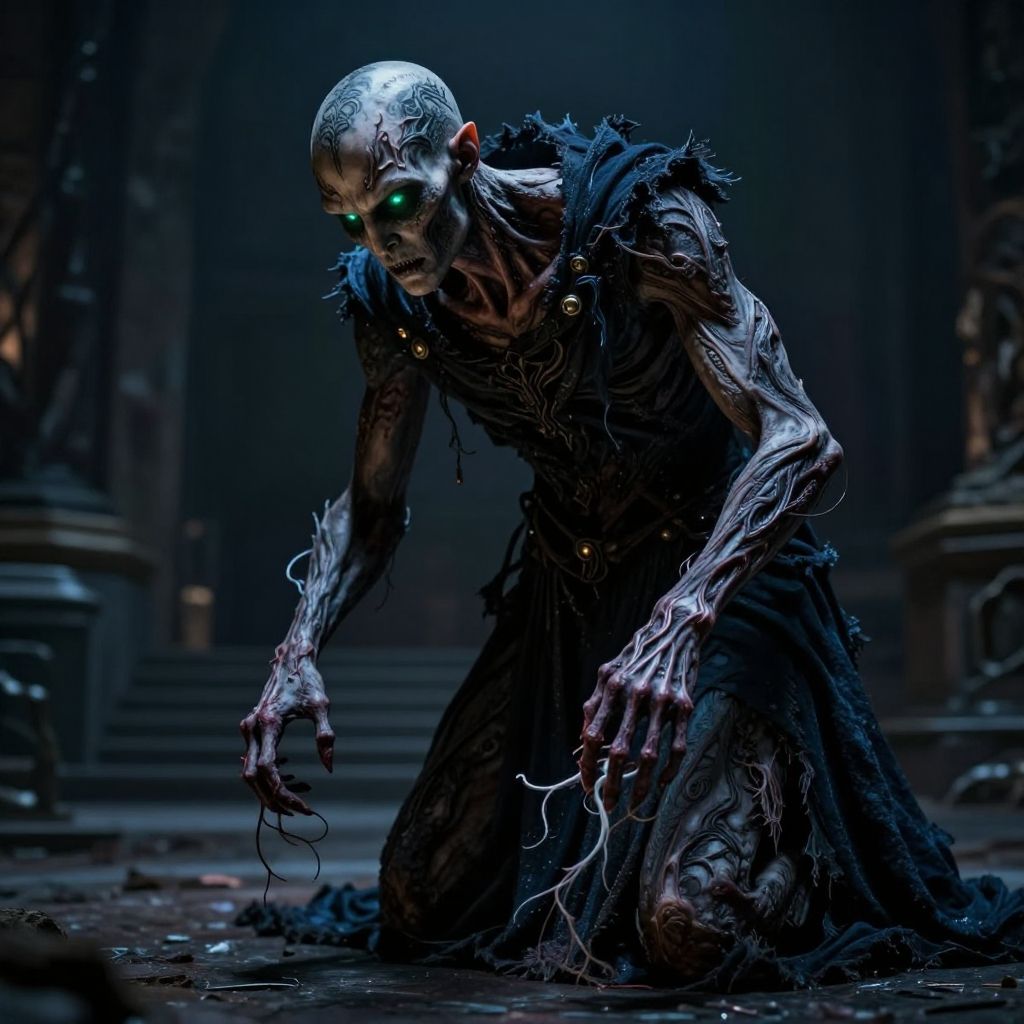 ((cinemtic shoot)) ((fantasy)), ((rpg)), ((focus on character)), full body shoot, photo of A wiry, emaciated figure with sickly gray skin stretched taut over a skeletal frame. His eyes burn with an emerald fire, and his shaved head is adorned with intricate tattoos that seem to writhe and pulse. Tattered robes of midnight blue hang loosely from his hunched form, and ethereal tendrils of corruptive energy coil around his bony fingers., intricated skin, realistic, ((photorealistic)) rim lights, dark shadows, cinematic scene, movie shoot, dark, extremely detailed, hard light hard shadows, shallow depth of field, vignette, highly detailed, high budget Hollywood film, cinemascope, moody, epic, gorgeous, detailed background, ((darkfull )), detailed, SK_ANALOGFILM