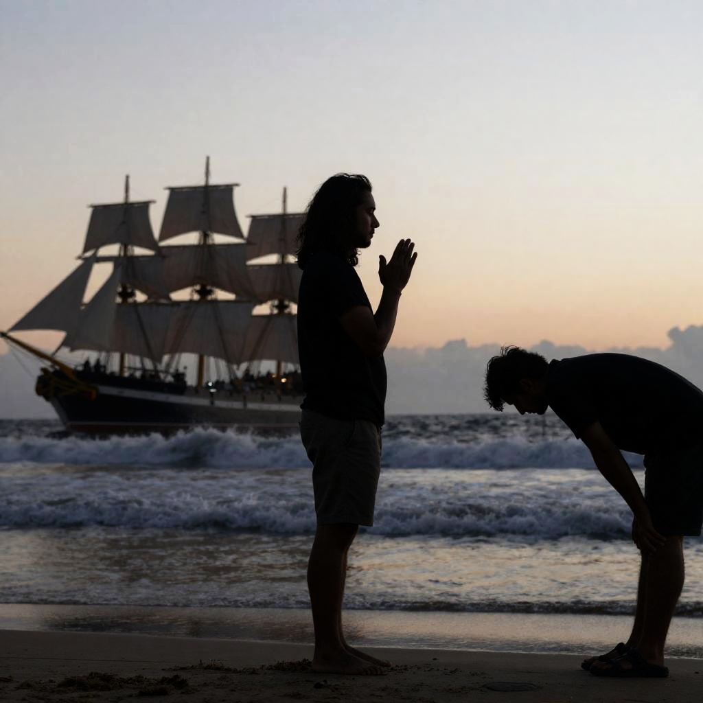 Photograph of a beach at sunset. Silhouetted man with long hair stands in profile, hands clasped in prayer. Another silhouetted person bends over on the right. Large ship with sails in background. Waves crash near shore.