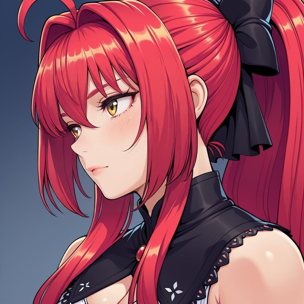 Digital illustration of an anime-style girl with very long red hair tied in a ponytail with a black bow. She has golden-yellow eyes, a small ahoge strand of hair, and is wearing a sleeveless black top with intricate lace detailing. The artwork highlights soft facial features and a contemplative expression.