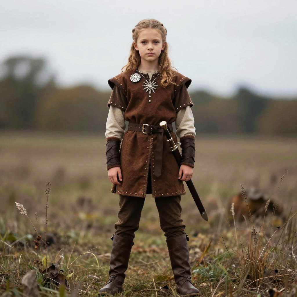 Youth Viking Costume, girl dressed in brown and brown outfit standing in field