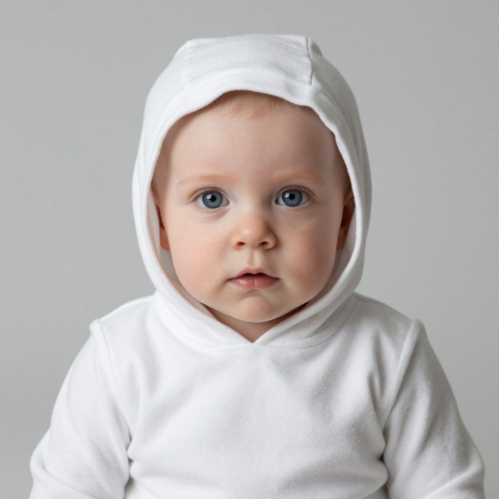 Photograph of a fair-skinned baby with bright blue eyes, wearing a white, ribbed, hooded sweatshirt with the hood up, covering the baby's head but leaving the face exposed. The baby has a neutral expression and a slightly rosy complexion. The background is a plain, light gray, providing a minimalistic and clean look. The texture of the sweatshirt is soft and slightly fuzzy, contrasting with the baby's smooth skin. The image is centered, focusing on the baby's face and upper body.