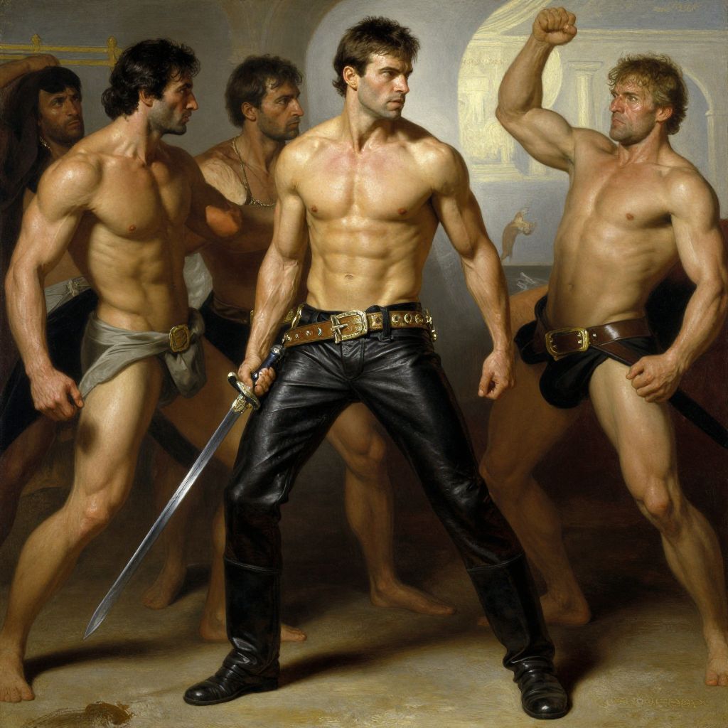 Photograph-style digital artwork of five muscular, shirtless men; central figure with black pants and sword, flanked by four in loincloths