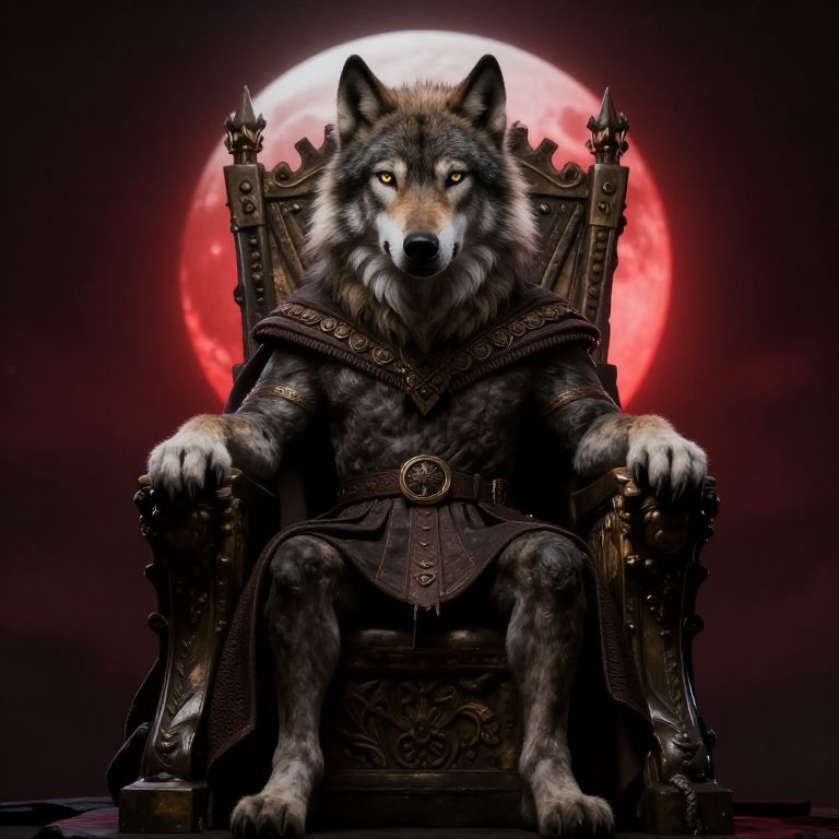 "Bumpy 1600 900, ultra realistic front photo, papa benedict with replaced head from wolf, sit on throne of avalone, bloodmoon on background,"