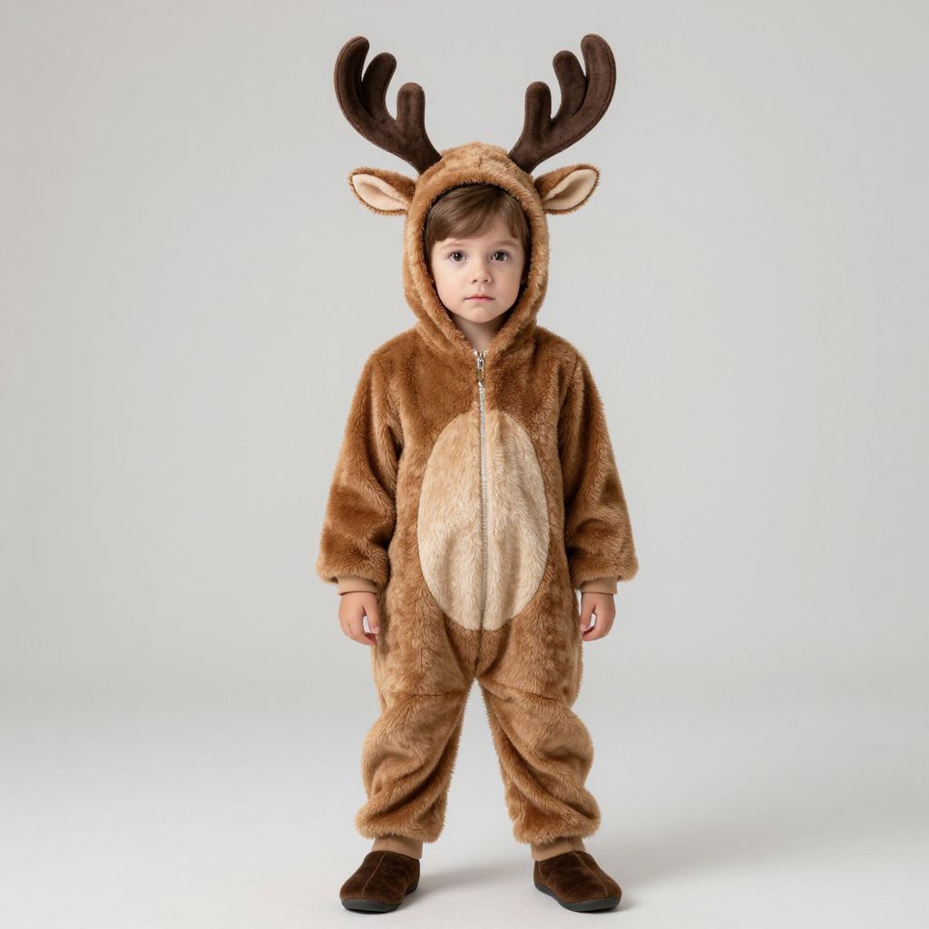 Darling deer infant costume, solo, animal costume, kigurumi, male focus, standing, 1boy, full body, reindeer costume, looking at viewer, antlers, realistic, brown hair, cosplay, closed mouth