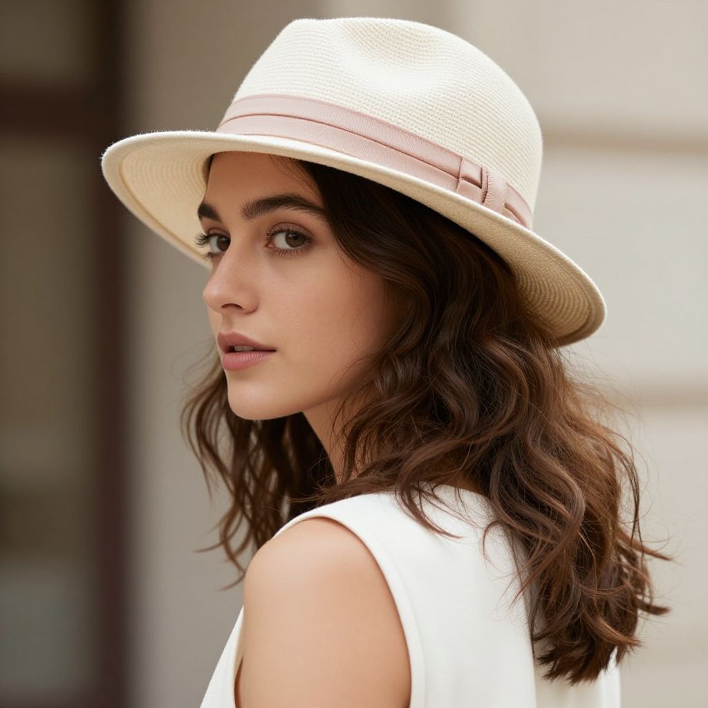 Woman wearing a cream trilby hat with a subtle pink band, styled with loose, wavy brown hair and a sleeveless white top, exuding a summery and elegant vibe.