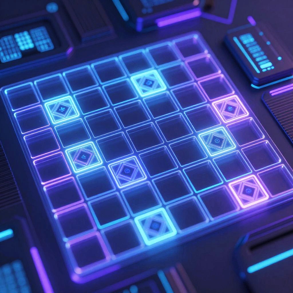 16x16 table grid, futuristic design, neon blue and purple hues, holographic display, digital interface background, sleek and modern, cyberpunk atmosphere