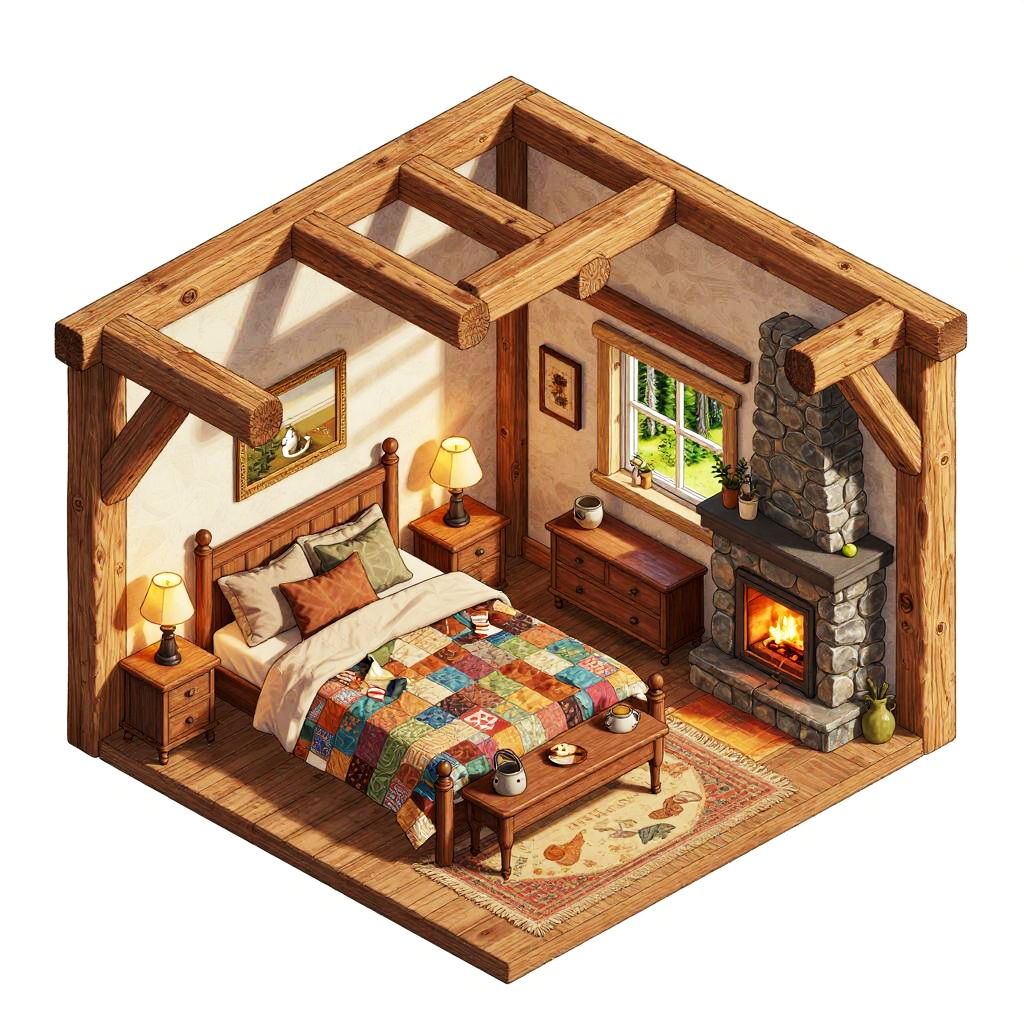 Isometric bedroom drawing portraying a rustic cabin style with wooden beams, a large comfy bed with patchwork quilts, a stone fireplace, vintage furniture, cozy rugs, and warm natural light streaming through a small window surrounded by forest scenery.