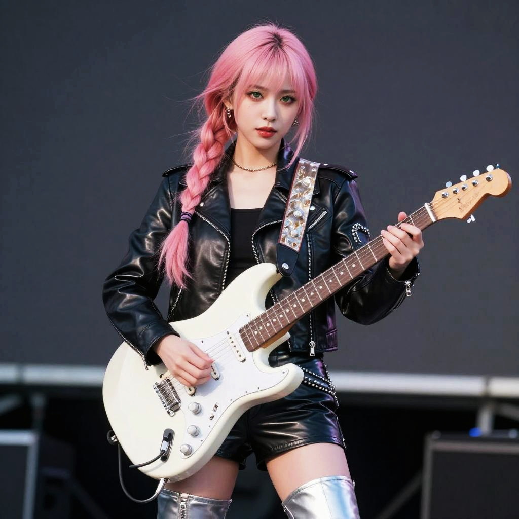 (best quality, masterpiece:1.2), (realistic, photo realistic:1.3), UHD, high detail color photo, extremely detailed CG unity 8k wallpaper, sharp focus, (natural shadow), (realistic skin), perfect anatomy, perfect hands, (cinematic lighting), glossy lips, 1girl, solo, stage_outfit, guitar, leather_jacket, silver_accessory, thigh-high_boots, pink_hair, dynamic_pose, (mature female, 19yo:1.1), (pink long hair, single braid:1.1) hair scrunchie, green eyes, (stage background:1.3)