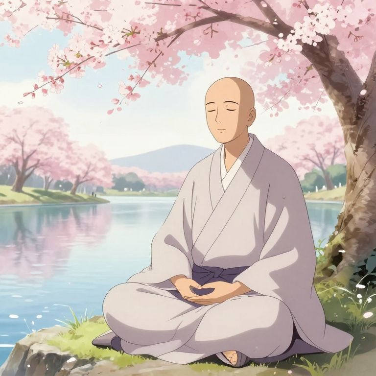 Anime-style illustration of a bald, meditating man in a white kimono, seated by a serene pond with cherry blossom trees.