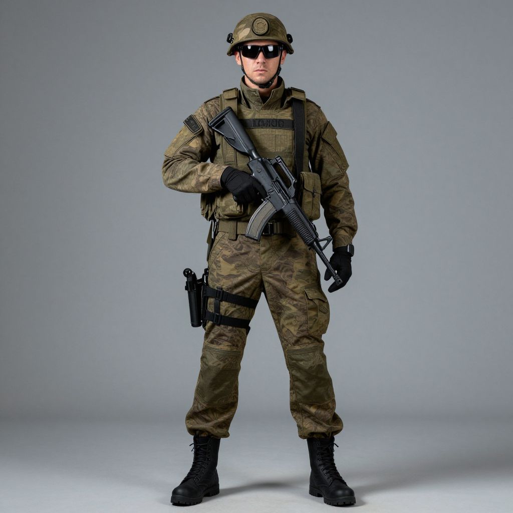 Photograph of a male soldier standing against a plain gray background. He is wearing a camouflage uniform with a tactical vest, black gloves, and black boots. He has a green helmet with a visor, black sunglasses, and holds a black assault rifle in his right hand. A holster with a handgun is visible on his left thigh. His facial expression is serious, and he stands with a slightly forward-leaning posture. The lighting is even, highlighting the details of his uniform and gear.