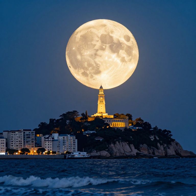 A coastal city perched atop a rocky island glows under the watchful gaze of an enormous, luminous moon that dominates the night sky, its surface etched with patterns that seem to pulse in harmony with the waves below.