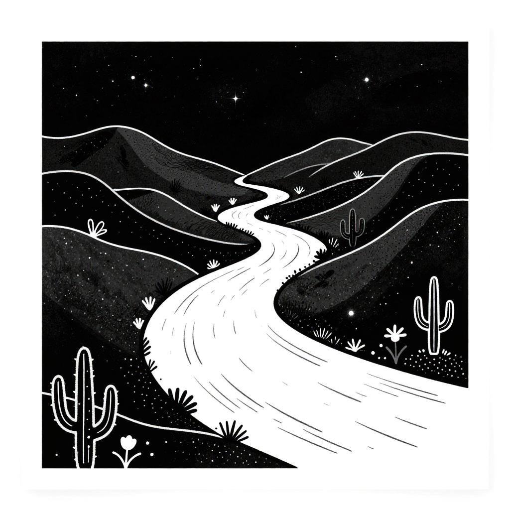 This black-and-white digital drawing features a winding river illuminated in white against a dark, starry night sky. Mountains and hills are outlined in white, with sparse vegetation like cacti and flowers dotting the landscape. The image is framed by a thin white border, creating a stark contrast with the dark background. The overall style is minimalist and abstract.