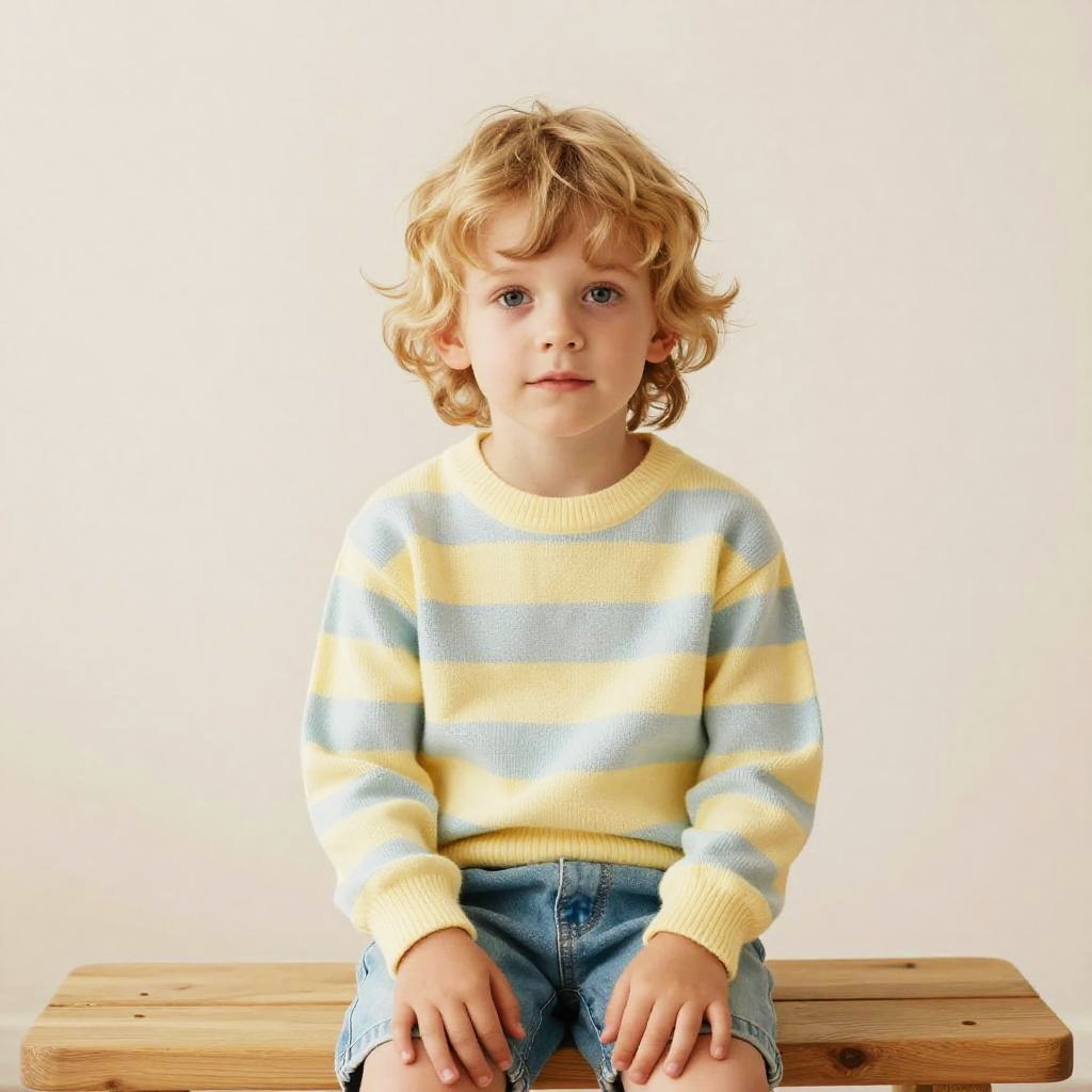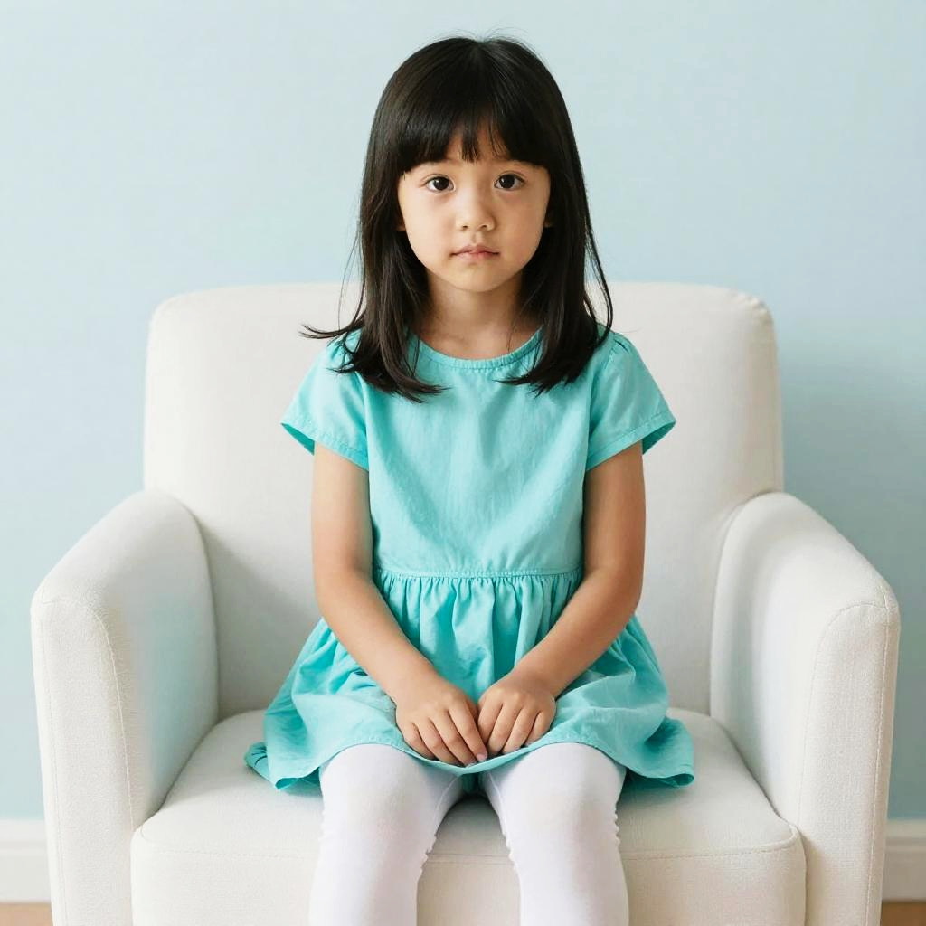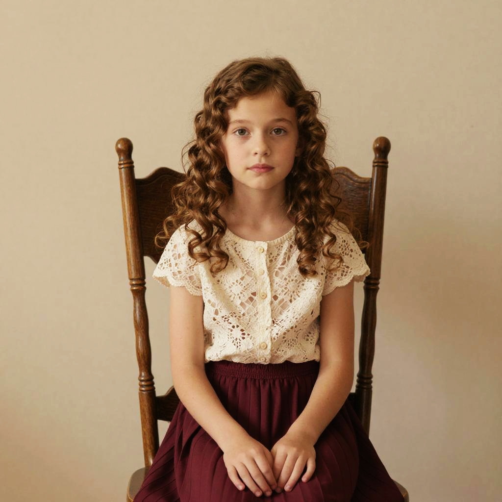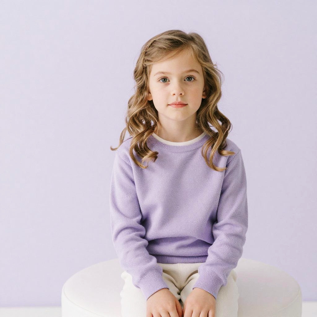 Studio photograph of preteen girl with very pale skin and long wavy dirty blonde hair, wearing soft lavender hoodie paired with pale gray sweatpants. The subject sits on a cozy cream-colored bean bag in a softly lit seamless studio, hands resting on lap. Soft, diffused light, pastel palette, centered framing, shallow depth of field, crisp focus on the eyes. Gentle, innocent mood, minimal props, airy background, natural skin tones, subtle film grain.