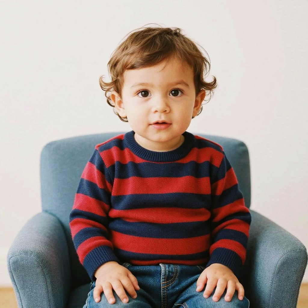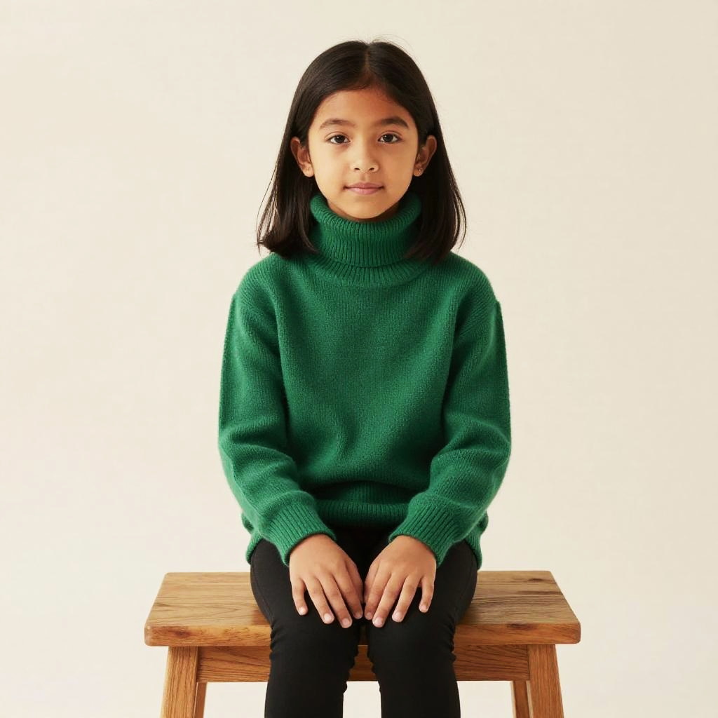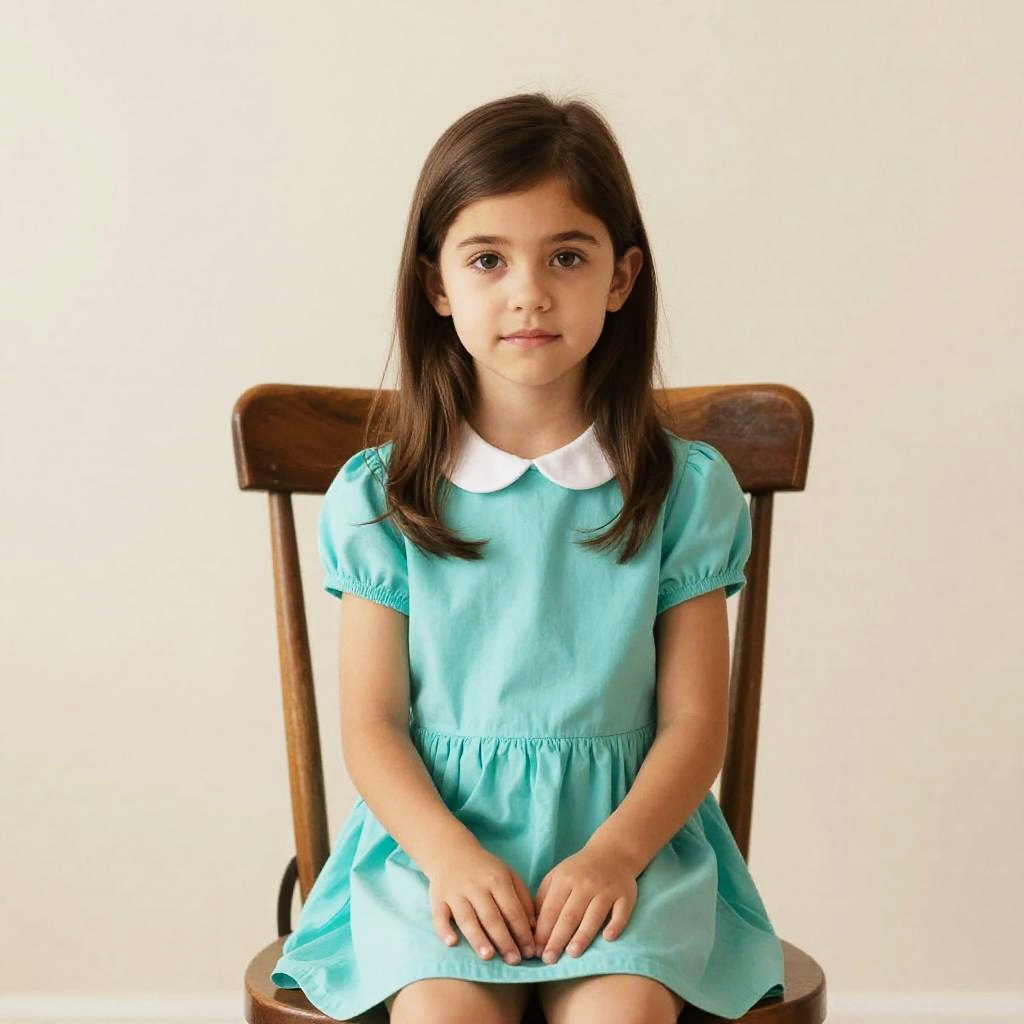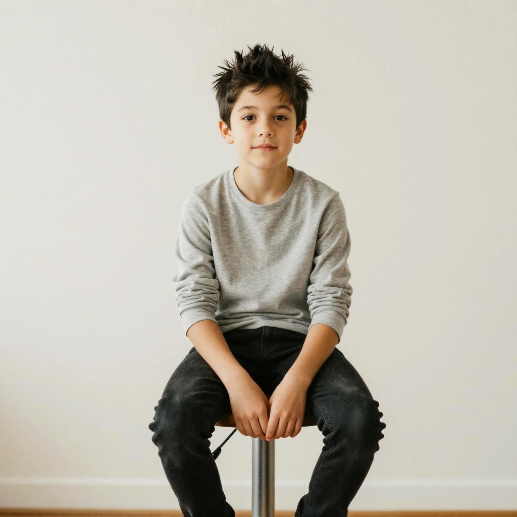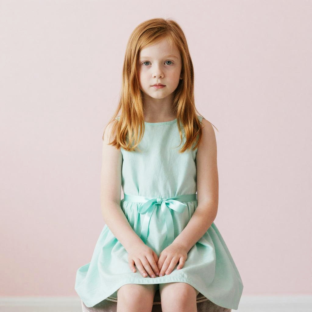 Studio photograph of preteen girl with very pale skin and long wavy dirty blonde hair, wearing soft lavender hoodie paired with pale gray sweatpants. The subject sits on a cozy cream-colored bean bag in a softly lit seamless studio, hands resting on lap. Soft, diffused light, pastel palette, centered framing, shallow depth of field, crisp focus on the eyes. Gentle, innocent mood, minimal props, airy background, natural skin tones, subtle film grain.