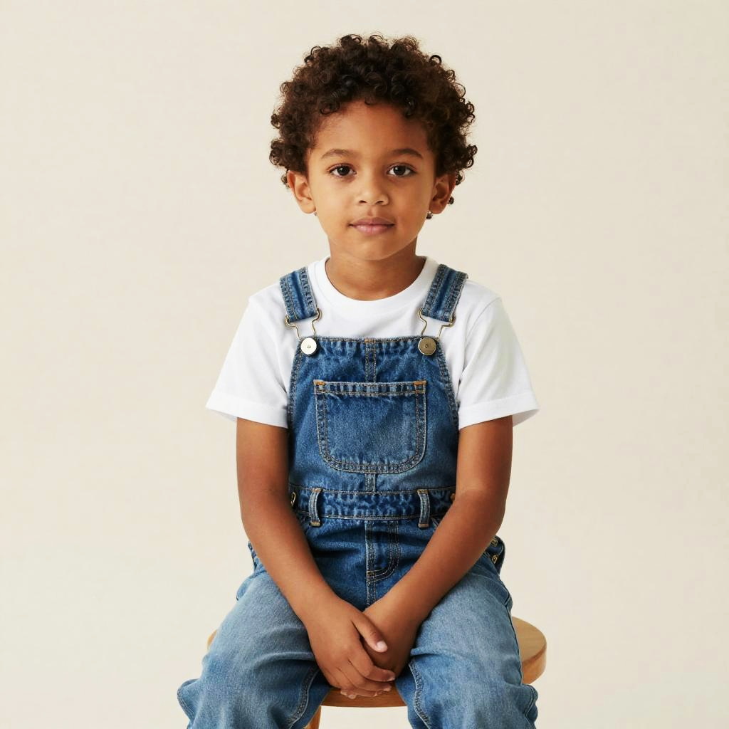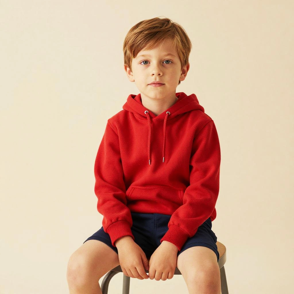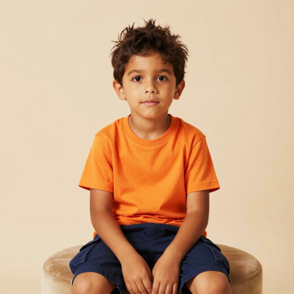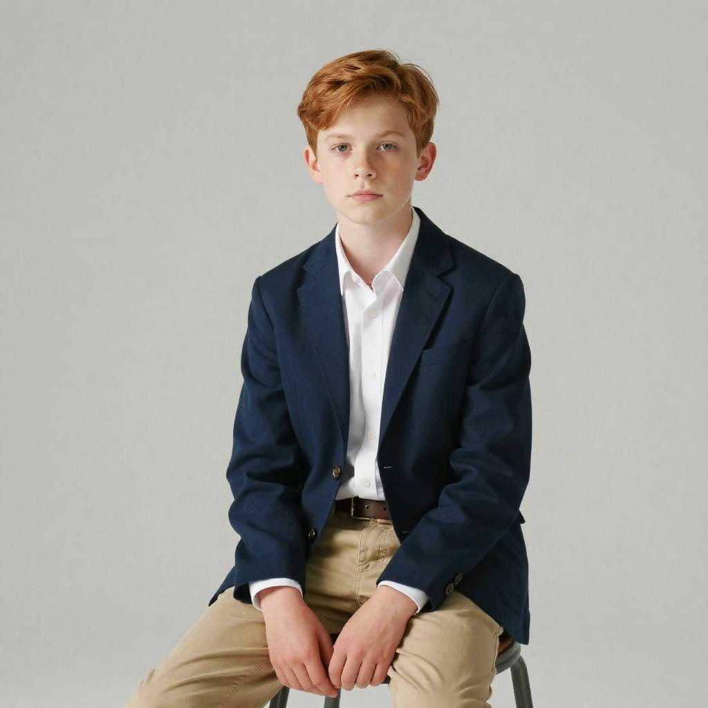 Studio photograph of preteen girl with very pale skin and long wavy dirty blonde hair, wearing soft lavender hoodie paired with pale gray sweatpants. The subject sits on a cozy cream-colored bean bag in a softly lit seamless studio, hands resting on lap. Soft, diffused light, pastel palette, centered framing, shallow depth of field, crisp focus on the eyes. Gentle, innocent mood, minimal props, airy background, natural skin tones, subtle film grain.