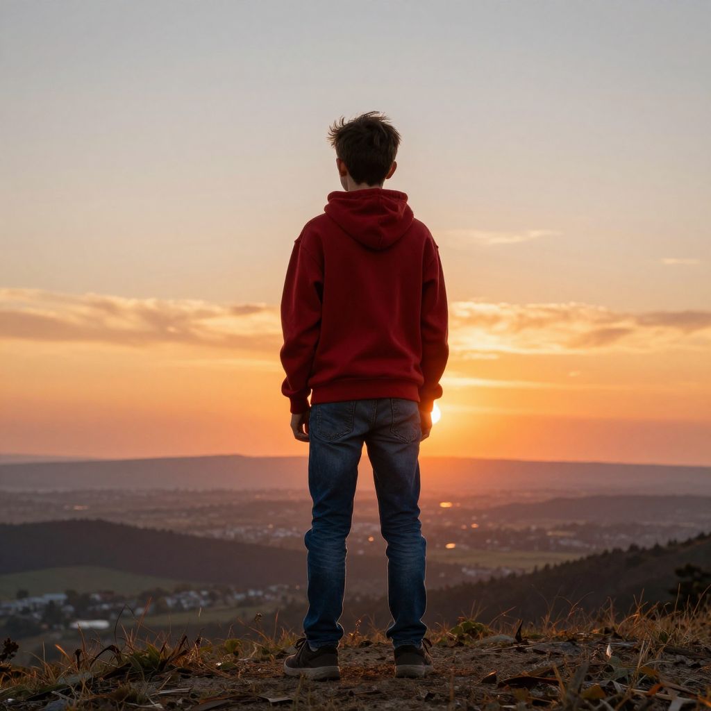 Boy facing backwards on a hilltop at sunset, wearing a red hoodie and jeans, with wind gently blowing, vibrant warm colors, cinematic lighting, detailed landscape background
