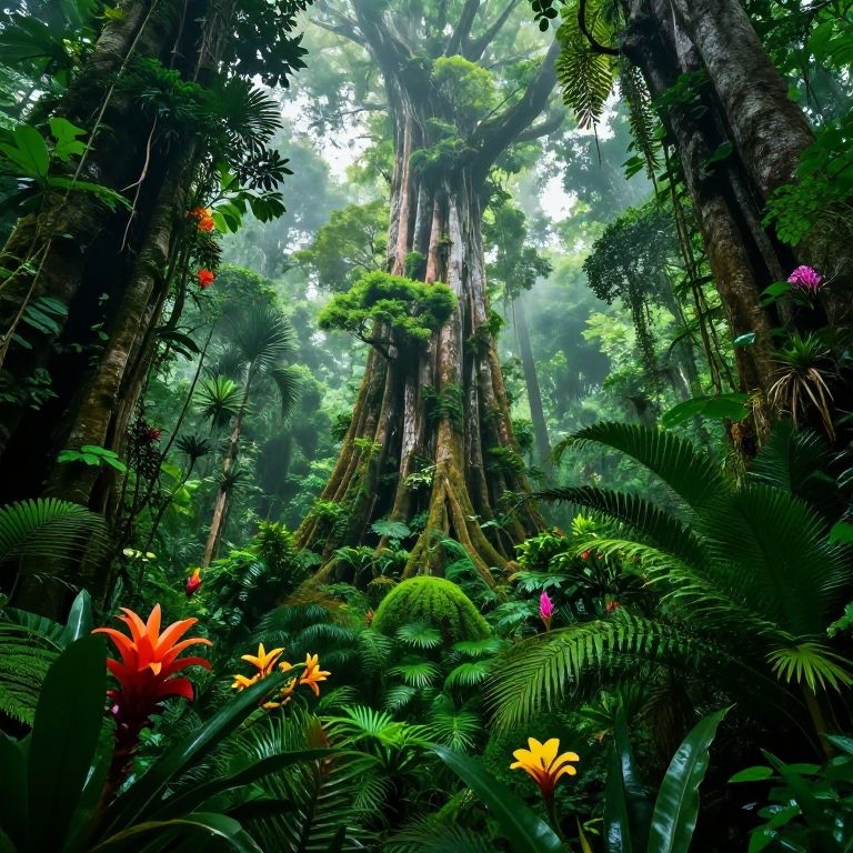 Tropical jungle art featuring lush, vibrant green foliage with exotic flowers and mist rising among towering ancient trees, a mystical atmosphere, vivid colors, intricate details, and a sense of wild untamed nature in a sun-dappled rainforest scene.