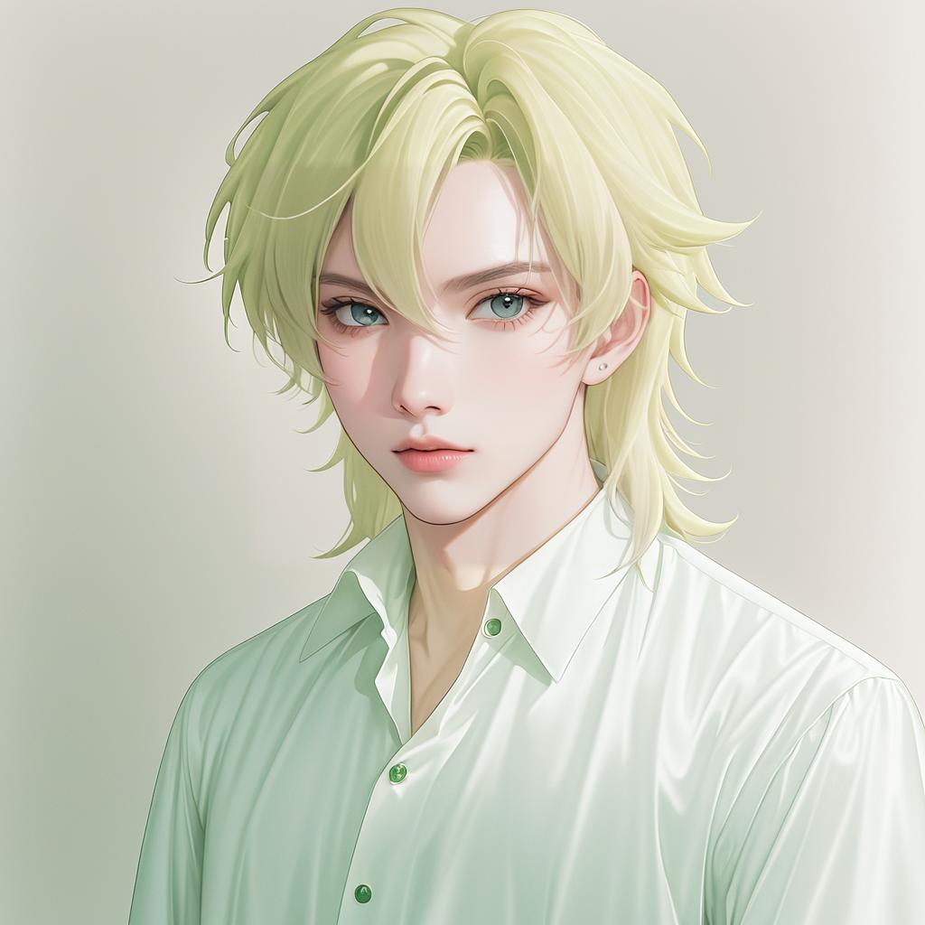 Alkaid mcgrath, lovebrush chronicles, 1boy, hair between eyes, green eyes, blonde hair, medium hair, long hair, white shirt, collared shirt, long sleeves, by artist kaga3chi, anime