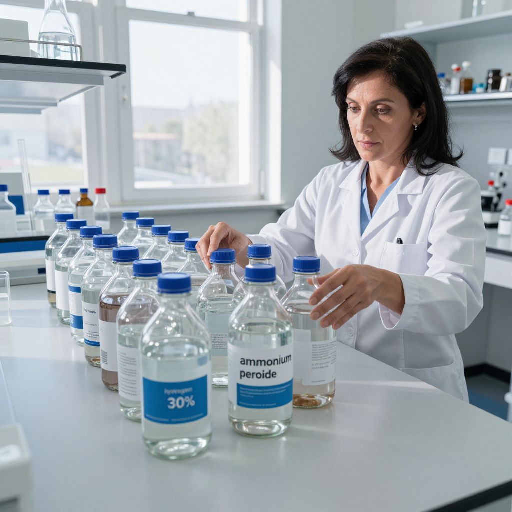 A wide-angle shot of a clean, modern chemistry lab with glass chemical bottles arranged in a precise grid on a white lab table; one bottle with a blue label reads 'hydrogen peroxide 30%', and another shows 'ammonium chloride'; the person in the image is a middle-aged woman with dark brown hair and kind eyes, wearing a lab apron, gently placing a new bottle into the row; natural daylight streams through the window, highlighting the reflective surfaces of the glasses and bottles.