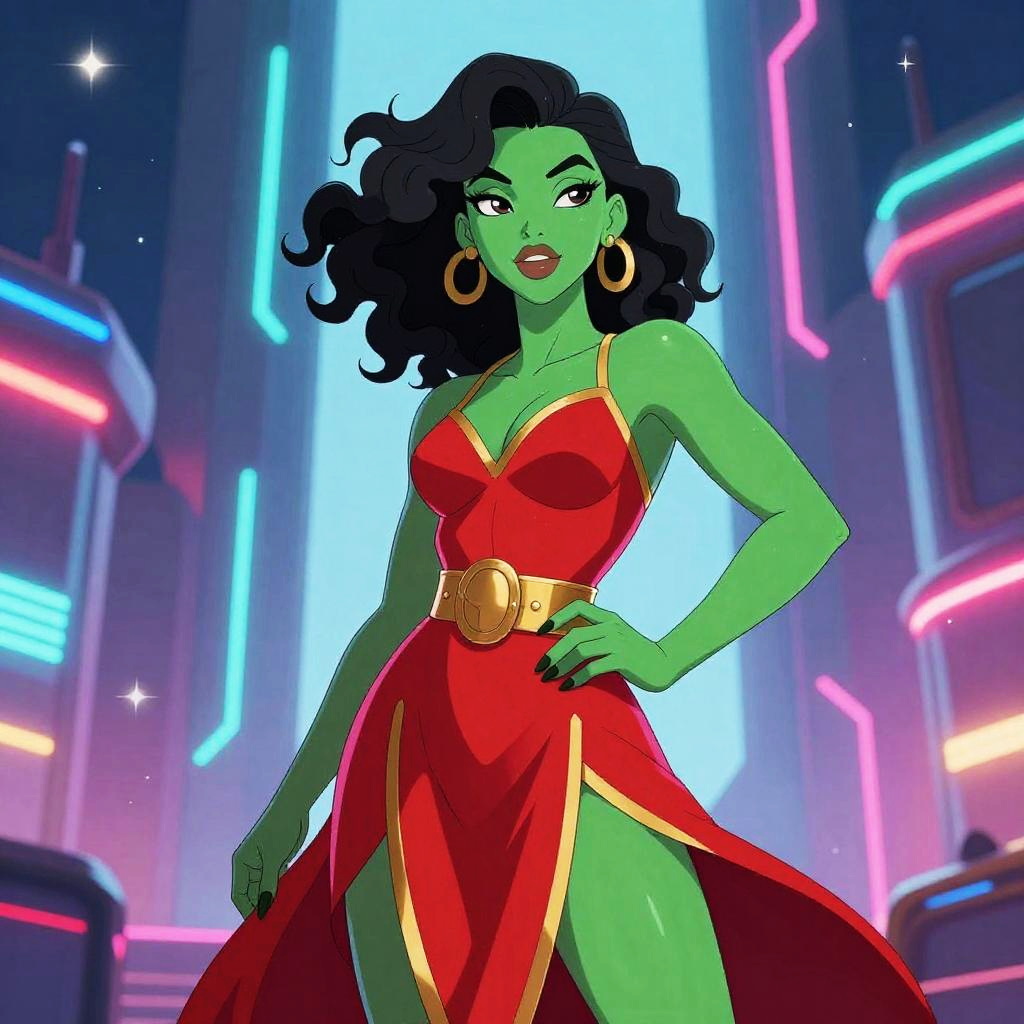This digital art features a stunning black woman with bright green skin and voluminous curly hair, wearing a flowing, red, sleeveless dress with gold accents and a high belt. She stands confidently in front of a futuristic, neon-lit building with glowing lights and starry background. The vibrant colors and sci-fi elements give the image an otherworldly, cyberpunk feel.