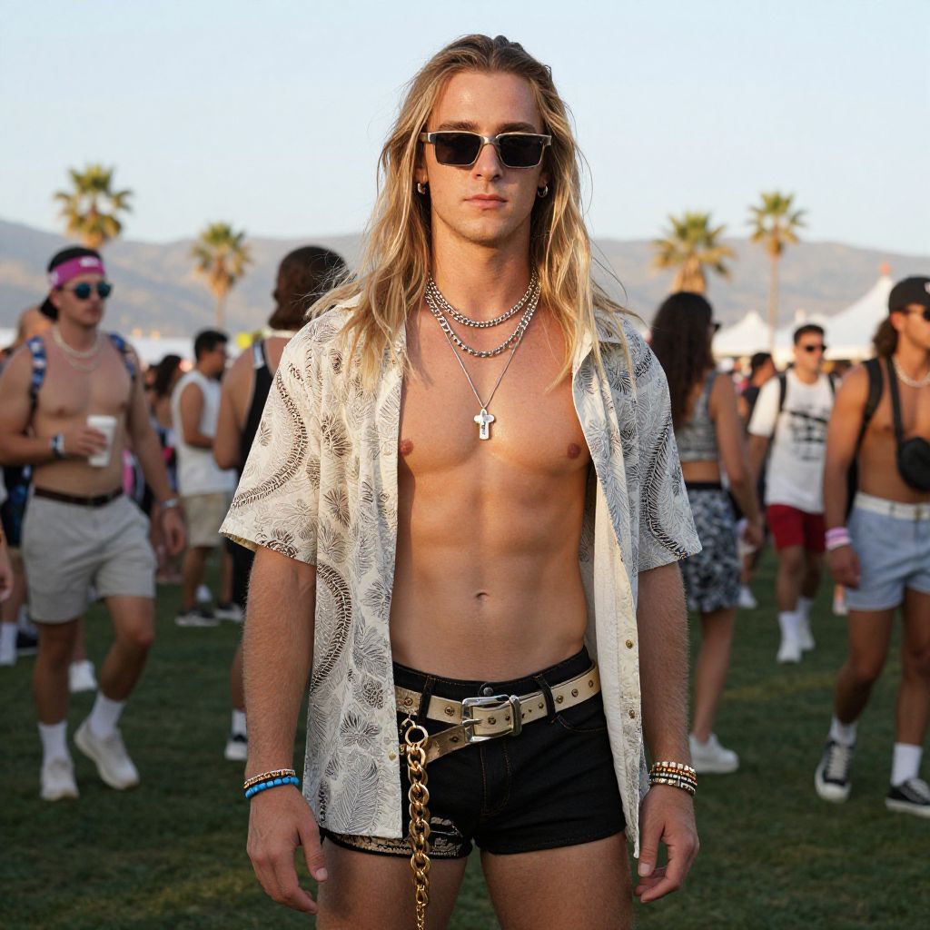 Photograph of a young man standing in a grassy outdoor festival field. He has curly, light brown hair and wears a tie-dye shirt with purple sleeves, blue bell-bottom jeans, and a colorful necklace. A guitar is slung over his right shoulder. The background is filled with festival-goers, some sitting on the grass and others standing, under a bright, sunny sky. Two colorful hot air balloons are visible in the distance. The crowd wears casual summer clothing, and the scene is lively and vibrant. The overall style is colorful and festive, capturing the essence of a lively outdoor festival.