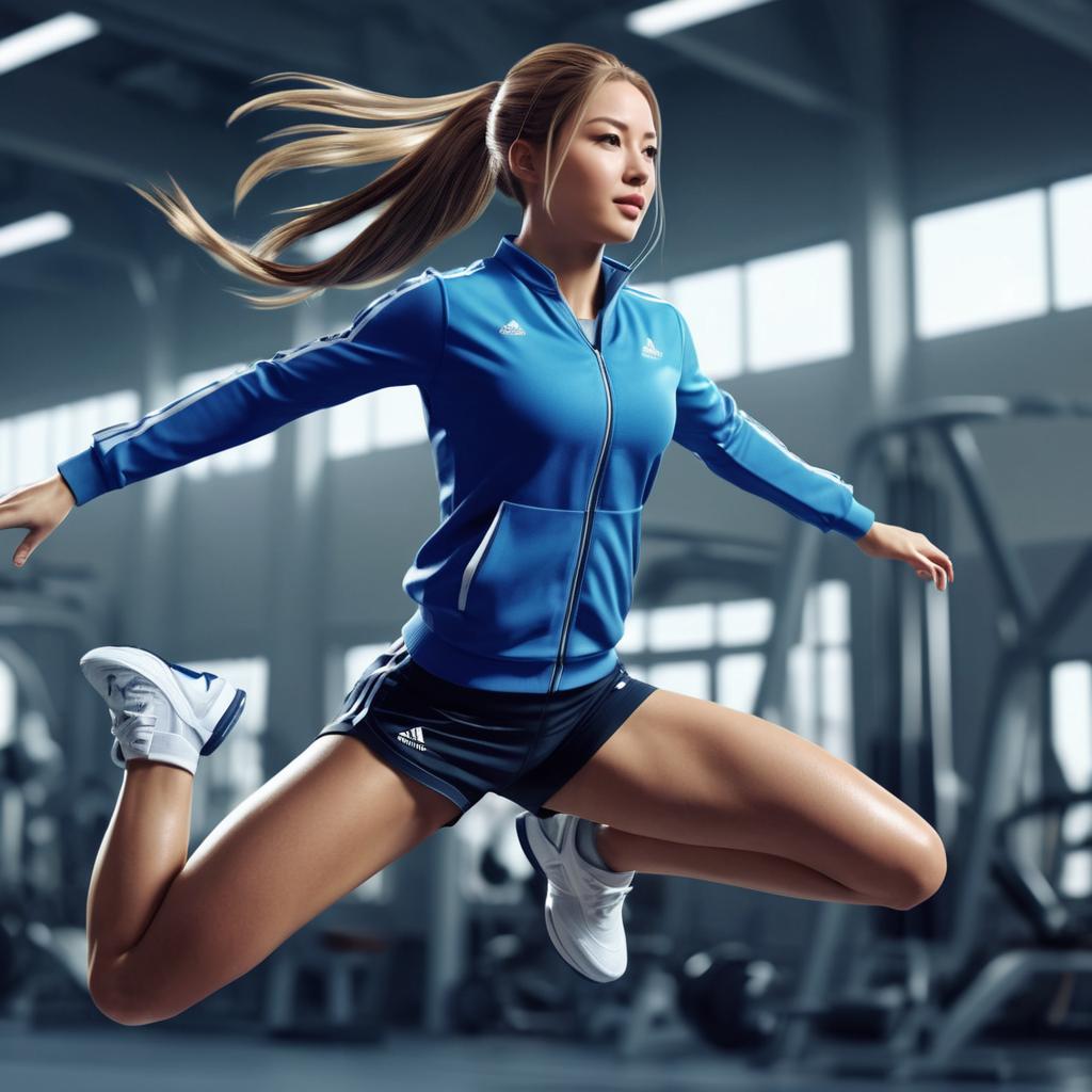Photorealistic digital image of an athletic Asian woman with long brown hair in a side ponytail, mid-air jump in a gym. She wears a blue zip-up tracksuit jacket with white Adidas logo, black Adidas shorts, and white athletic shoes. Her expression is focused, and her arms are outstretched. The background is a blurred gym with bright windows and various exercise equipment. Her skin tone is light, and her muscles are toned, highlighting her fitness. The lighting is bright, emphasizing her form and movement.