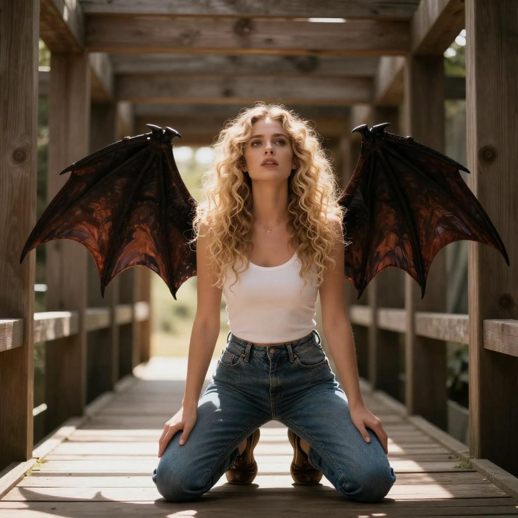 Woman with long, curly blonde hair and dark, dragon-like wings kneels in a wooden tunnel. She wears a white tank top and high-waisted jeans. Sunlight streams through the tunnel's end. Wooden beams and planks form the tunnel structure. She looks upward with a slightly intense expression.