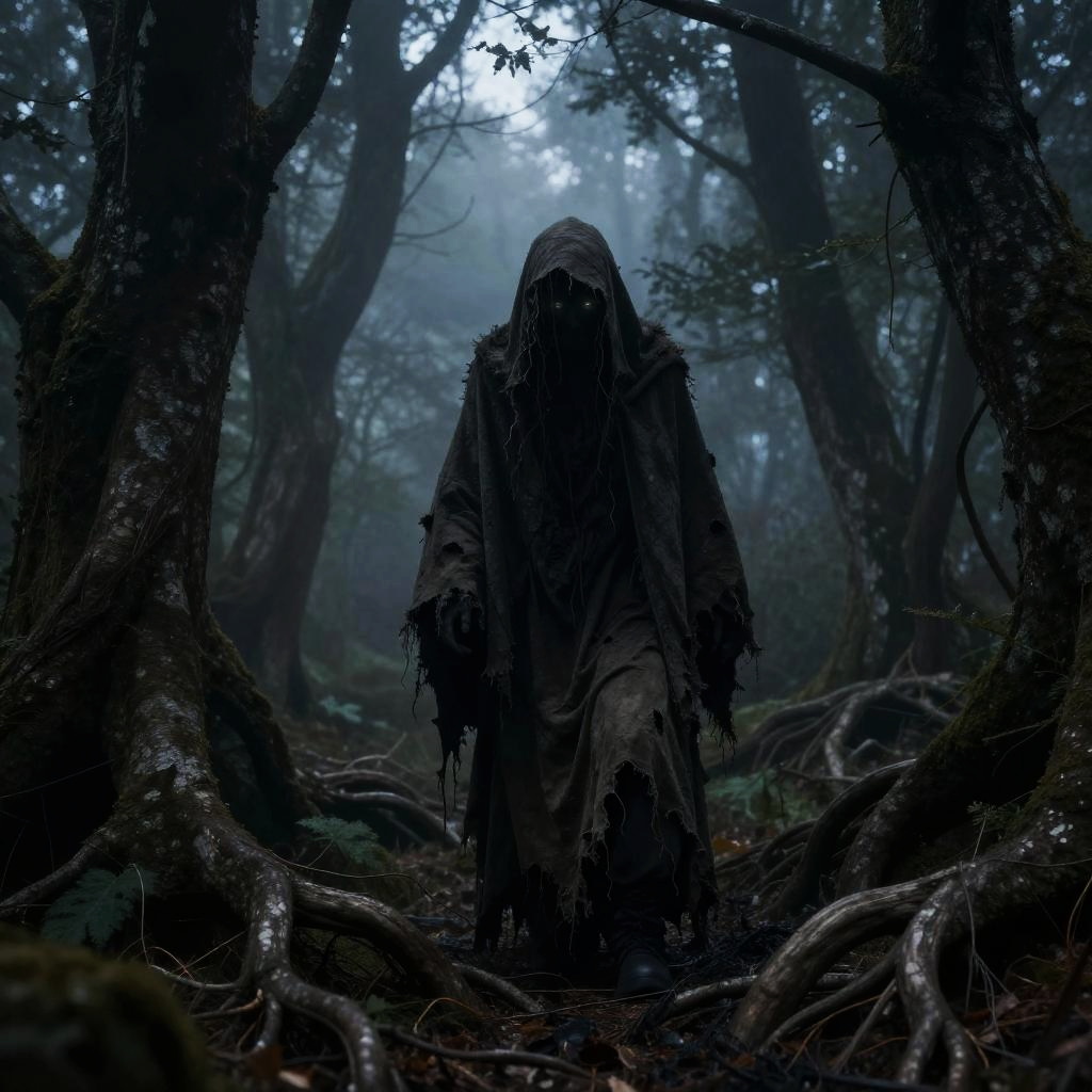 Shulking figure lurking in the shadows of a misty forest at twilight, cloaked in tattered rags, eyes glowing faintly with mysterious energy, surrounded by gnarled trees and twisted roots, eerie atmosphere, dark fantasy style, highly detailed environment.