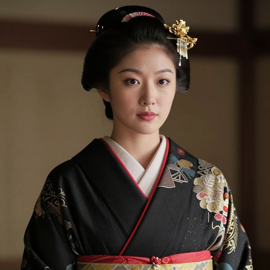 Photograph of a young Asian woman with fair skin, wearing a black floral kimono with red obi, black hair in an updo adorned with