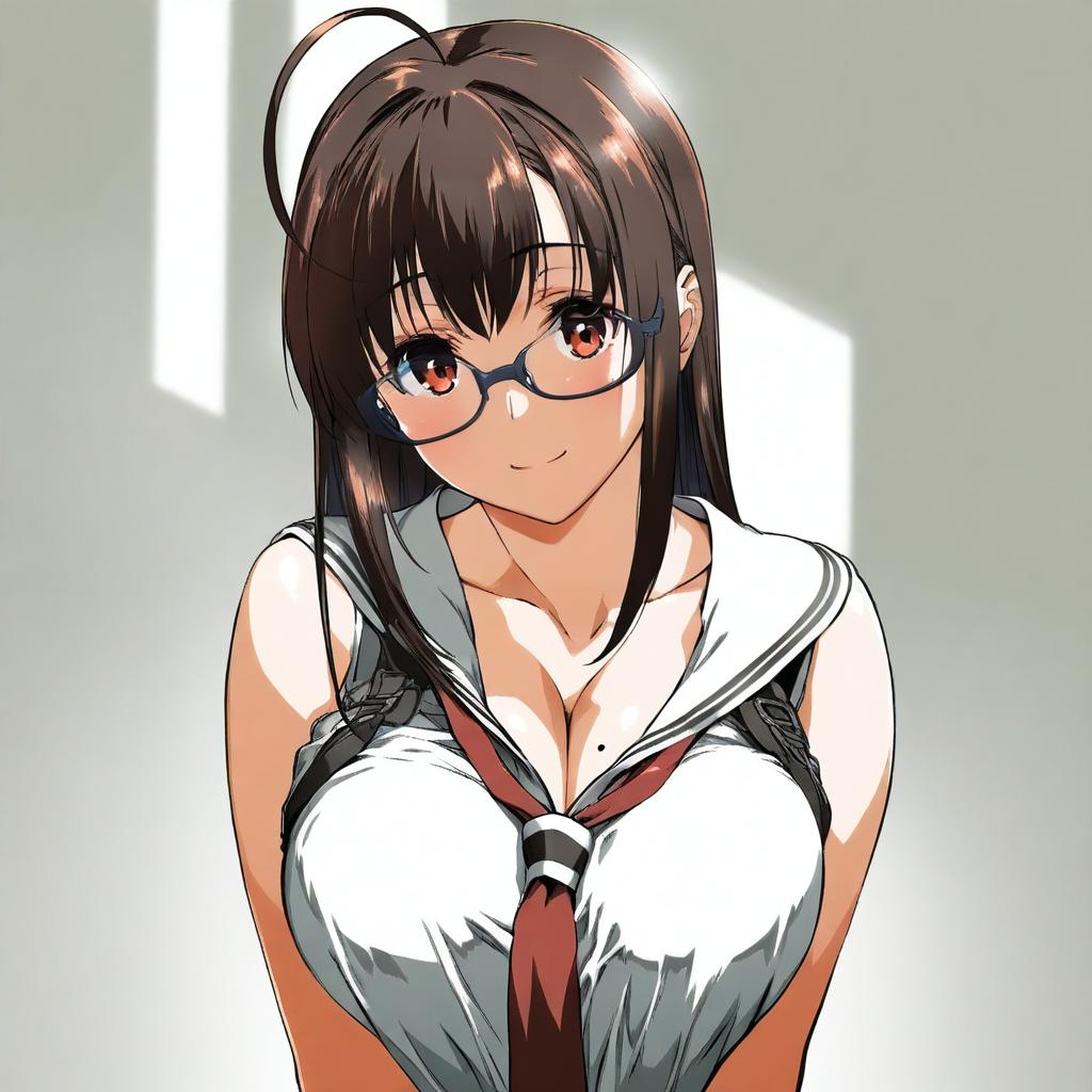 Arima senne, original, 1girl, red eyes, glasses, brown hair, long hair, ahoge, large breasts, mole on breast, by artist kagematsuri, animagine