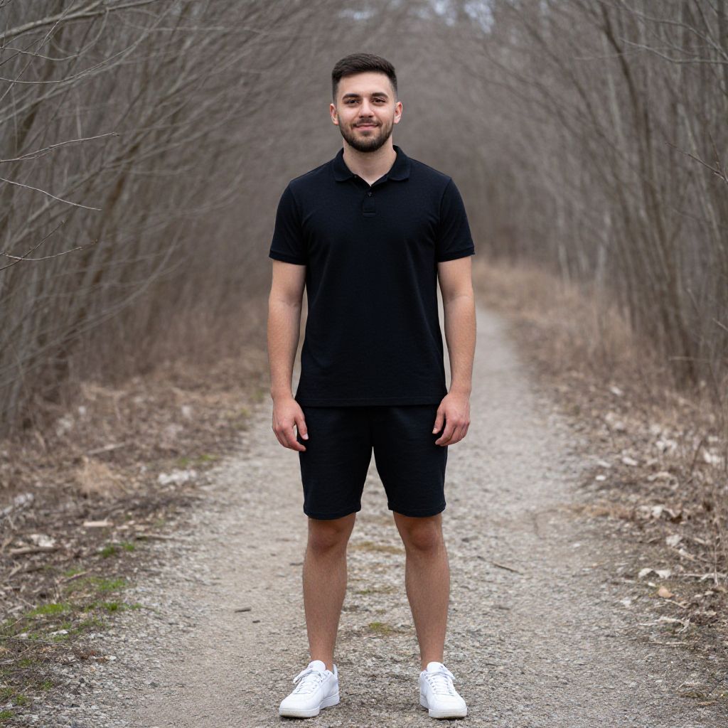 Photograph of a young man standing on a gravel path in a wooded area. He has short, dark hair, a trimmed beard, and is smiling slightly. He's wearing a black polo shirt, black shorts, and white sneakers. The path is narrow and surrounded by dry, leafless bushes. The background is slightly blurred, highlighting the man in the foreground.