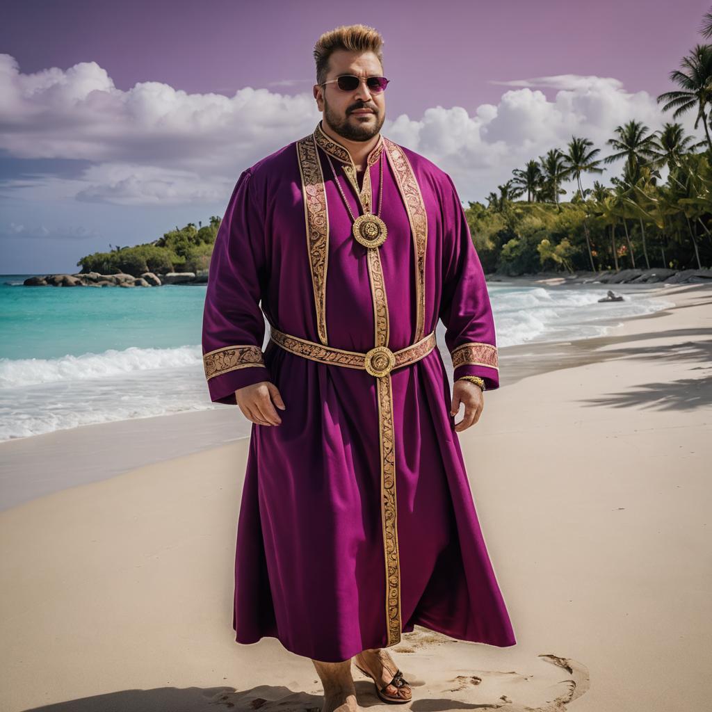 Man in Ornate Priest Robe on Tropical Beach